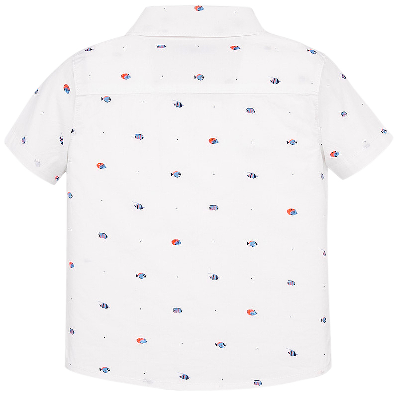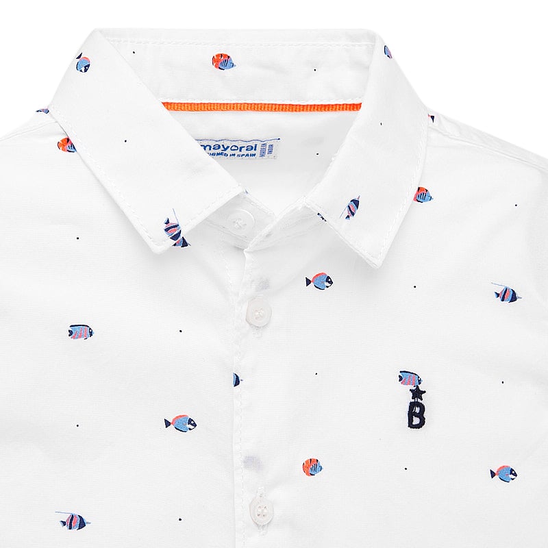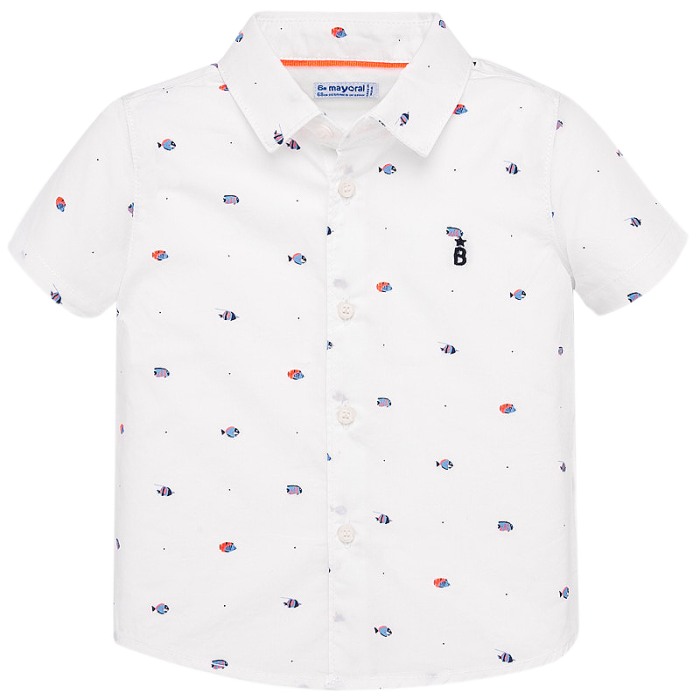 Camasa maneca scurta - Pestisori Camasa cu maneca scurta are un guler clasic, iar inchiderea camasii se face cu nasturi, pe partea din fata.Tesatura din popelin este durabila si usor de ingrijit. Elemente decorative: broderie pestisori.Material: 100% bumbac