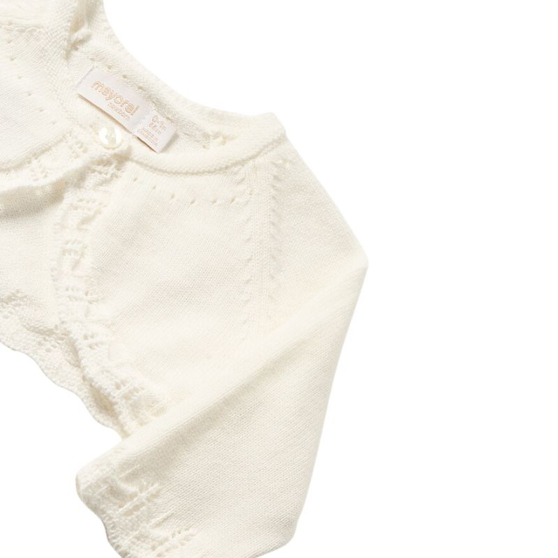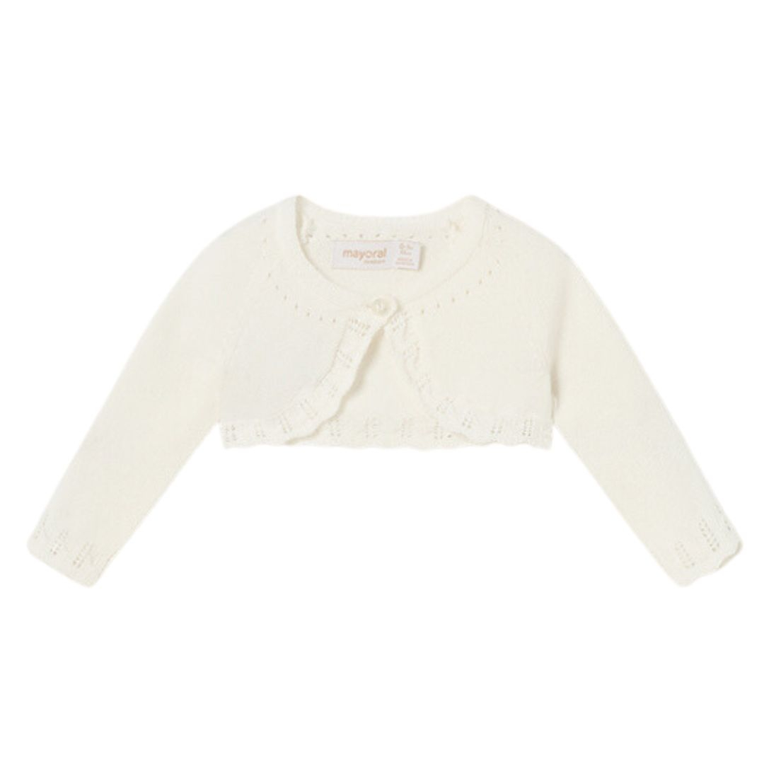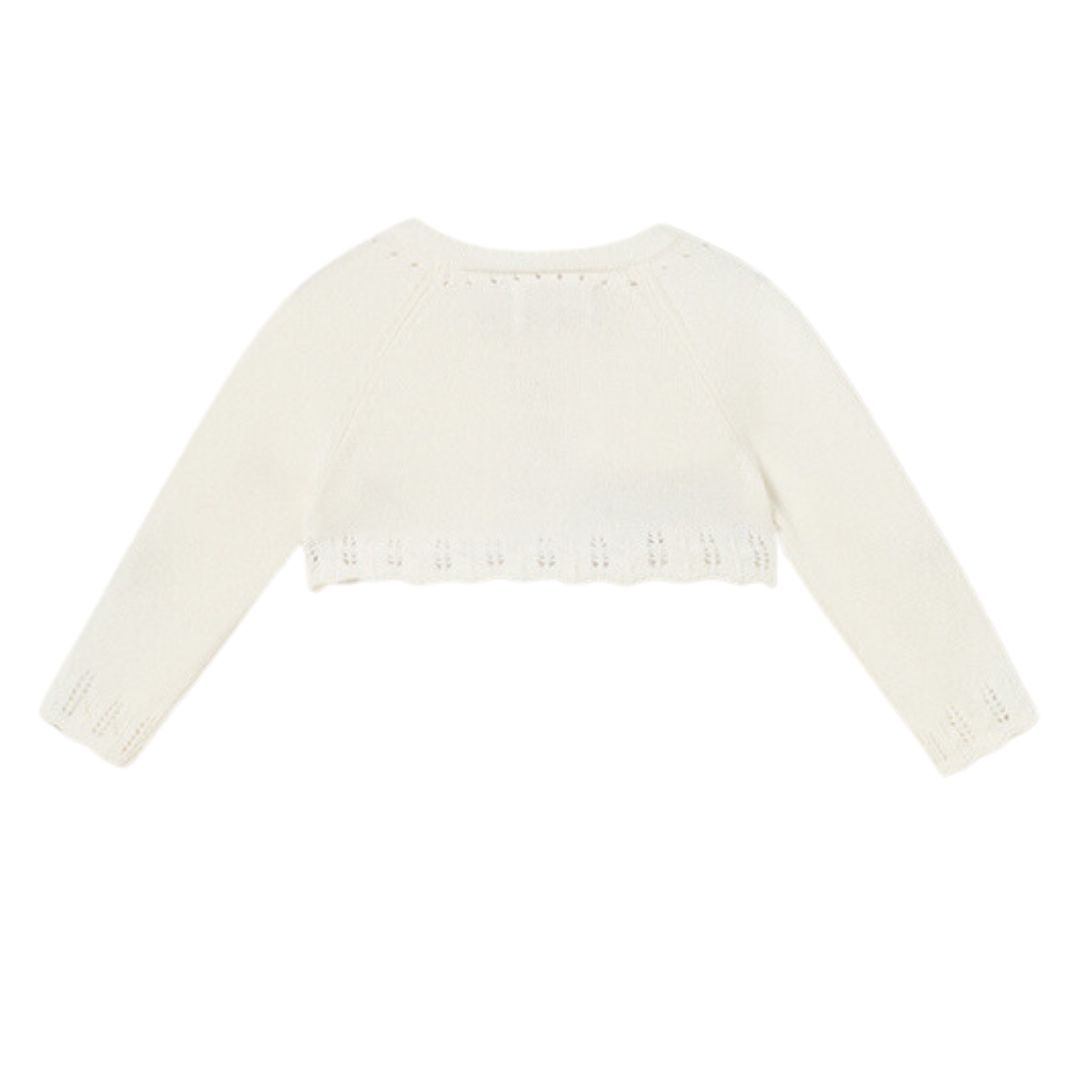 Cardigan Bej cu bumbac sustenabil Mayoral Acest cardigan cu maneca lunga are gulerul rotund, inchidere cu un singur nasture pe decolteu si cu volanase la maneci.Este un model scurt, tip bolero si cu terminatii cu perforatii pentru efect de dantela.