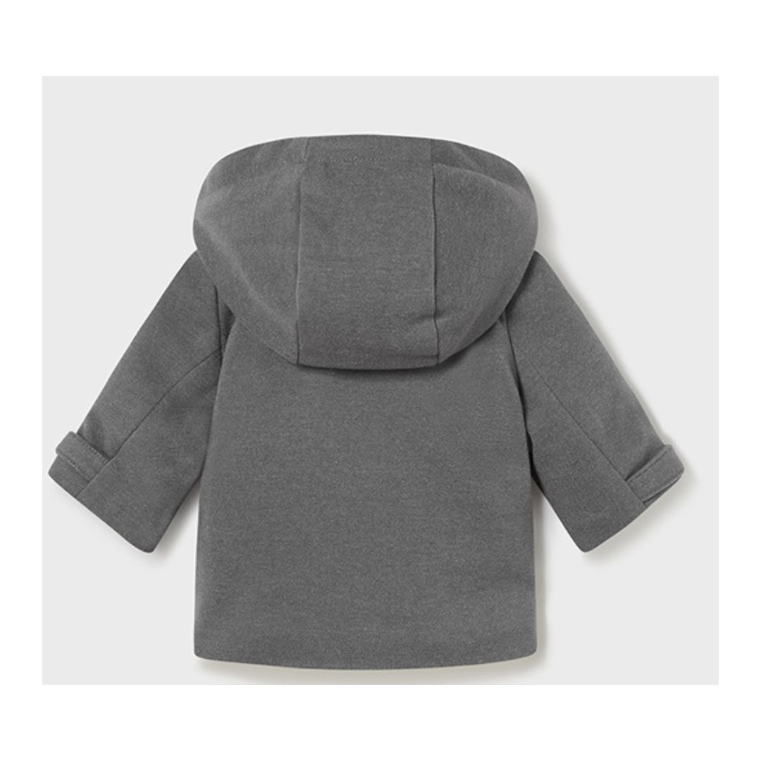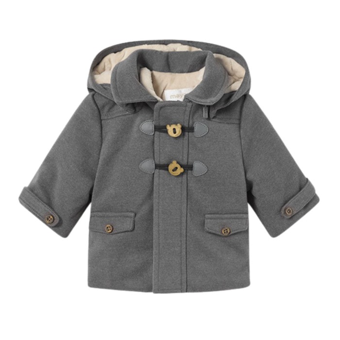 Cardigan (Trench) poliester reciclat nou-nascut - Gri - Mayoral Jacheta cu maneca lunga are gluga si captuseala pufoasa. Stofa groasa din exterior este gri inchis iar captuseala bej din interior (minki extrem de moale si fin la atingere) este calduroasa si pufoasa. Inchiderea se realizeaza cu fermoar si nasturi ursulet pe partea frontala. Elemente decorative: buzunare cu nasturi.Material: exterior - 88% Poliester 10% Viscoza 2% Elastan captuseala - 100% poliester umplutura 100% Poliester