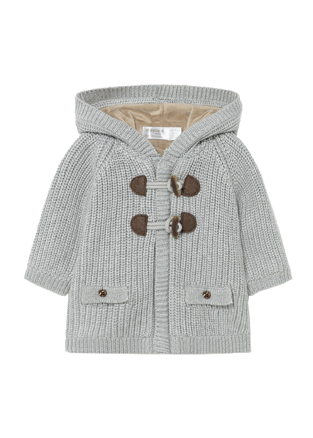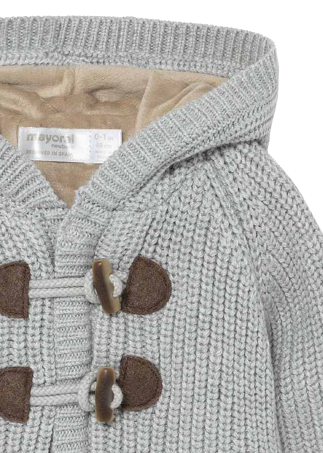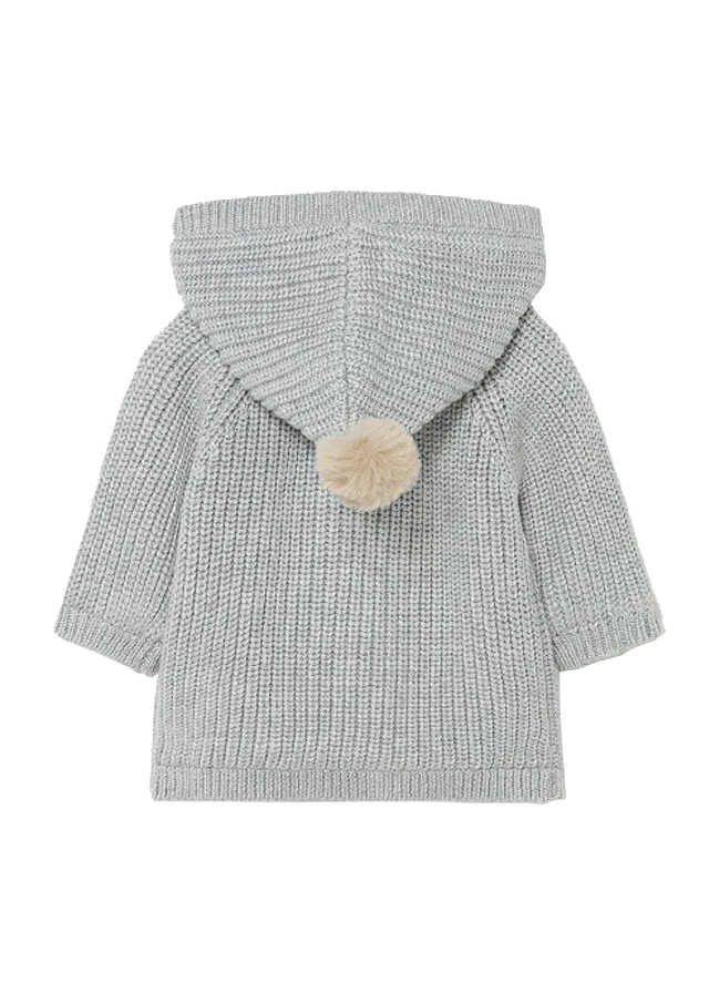 Cardigan tricot - Gri - MayoralJacheta cu maneca lunga are gluga si captuseala din blanita. Tricotul gros din exterior este gri deschis iar blanita caafenie din interior (minki extrem de moale si fin la atingere) este calduroasa si pufoasa. Inchiderea se realizeaza cu fermoar si nasturi pe partea frontala. Elemente decorative: pompon bej din blanita pe gluga.Material: exterior - 51% fibre acrilice / 49% bumbac captuseala - 100% poliester