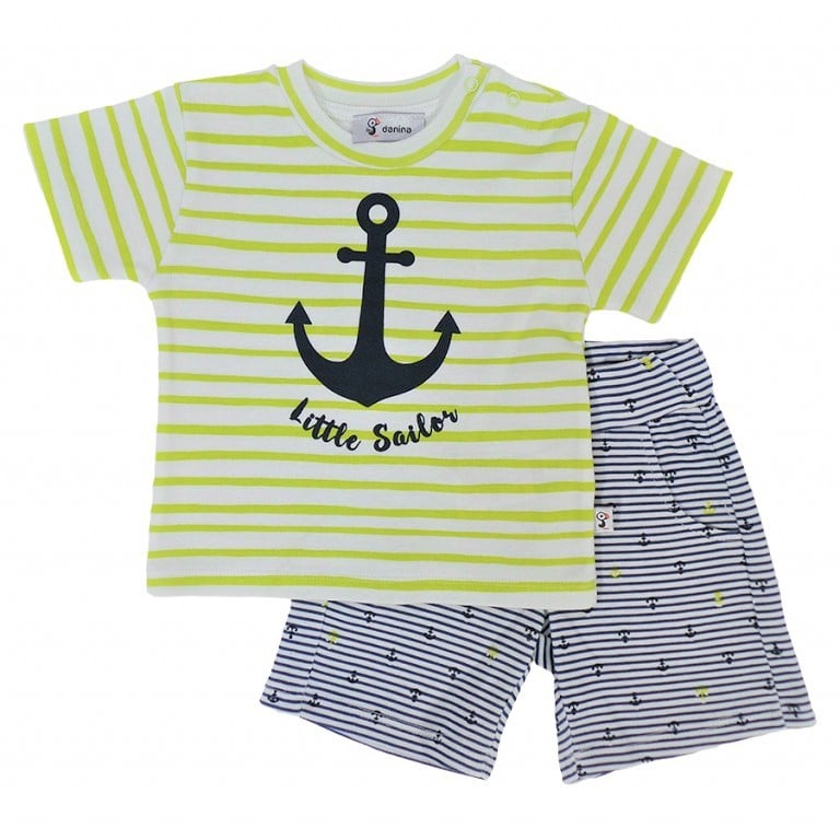 Compleu doua piese alb/vernil Ancora Compleul contine: pantaloni scurti si tricouPantaloni - pantalon scurti cu banda elastica in talie si buzunare laterale. - croiala este lejera iar compleul poate fi o tinuta de zi super comoda sau de ce nu o pijama lejera.Culoare: albastru./albDesign: ancore mici albastru/vernil.Tricou - tricou cu maneca scurta.Culoare: alb/vernil Imprimeu: dungi/ancora albastraIntretinere: Spalare: automata / manuala Temperatura: max. 30°C Interzis: albirea si uscarea la tambur Calcare: temperatura medie Fabricat in Romania