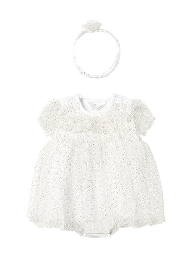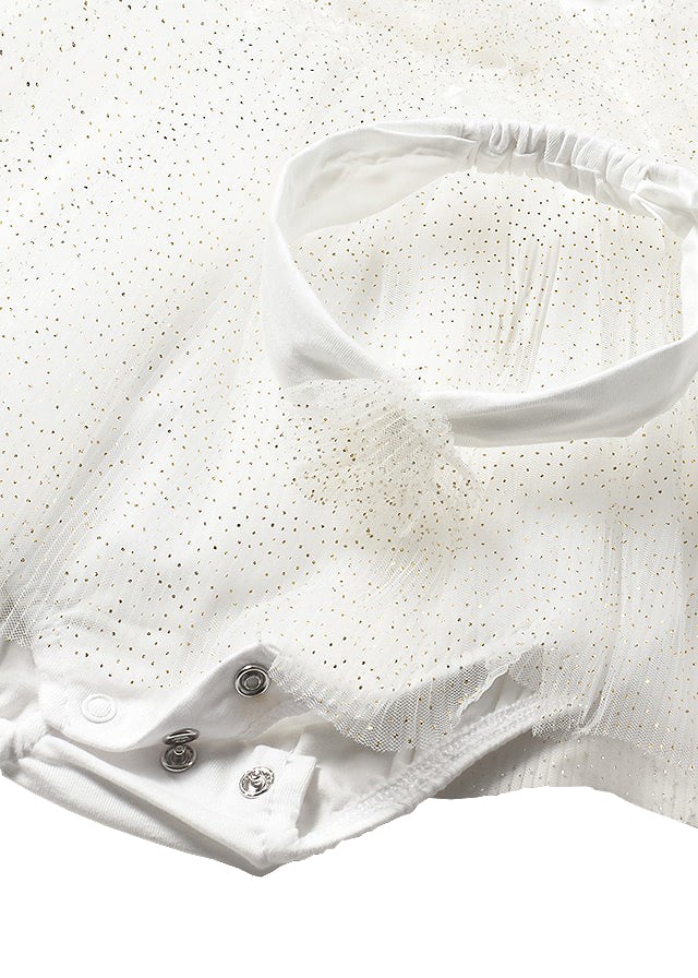 Costumas (rochita) cu tul + diadema - nudeCostumasul (rochita) are maneci bufante si gulerul rotund.Inchiderea se face cu capse pe umeri si intre picioruse, pentru a usura imbracarea ei.Materialul exterior este din tul, lejer si vaporos.Elemente decorative: model cu elastic adunat pe piept, sclipici, volanaseBentita este perfecta ca accesoriu pentru a completa tinuta. Materialul este moale din bumbac elastic.Poti combina acest accesoriu cu orice tip de look.