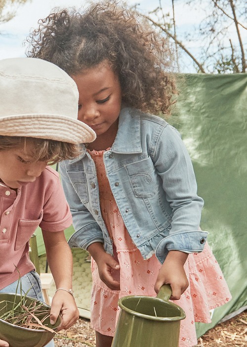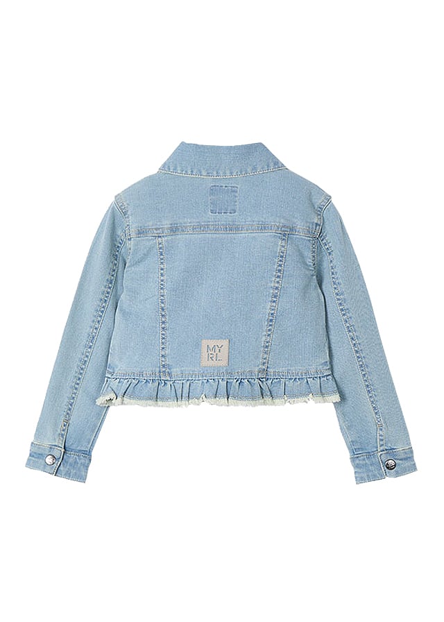 Geaca blugi - bleu - volane Geaca de blugi are maneci lungi cu mansete, gulerul rotund, iar inchiderea se face cu capse metalici pe partea frontala.Buzunarele sunt functionale pe partea frontala.