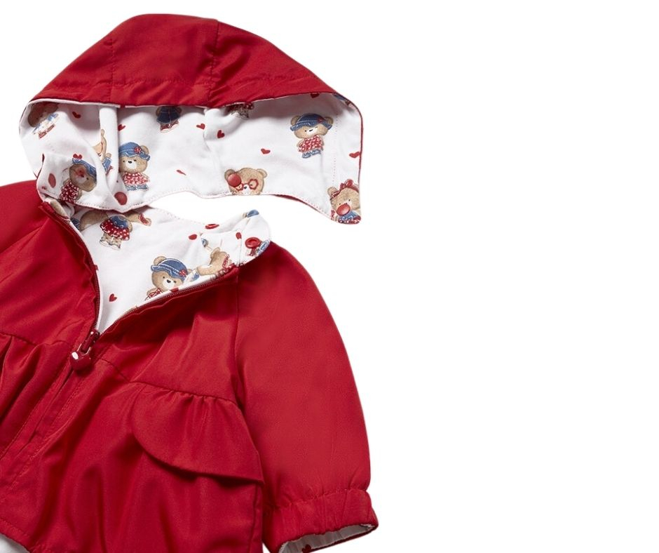 Buzunarele sunt functionale pe ambele fetea. Materialul este lejer, respirabil, pentru un confort deosebit.Acest model se poate purta fata / verso (reversibil).Material: exterior -  100% poliester                    interior - 95% Bumbac 5% ElastanCuloare: alb / rosu / albastruImprimeu: uni/ursuleti