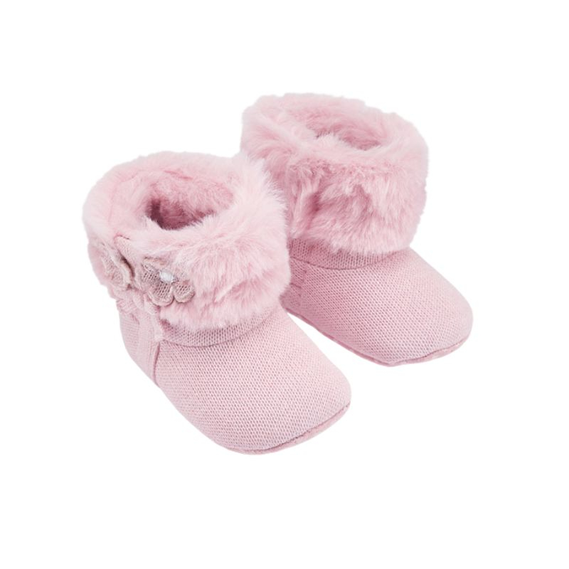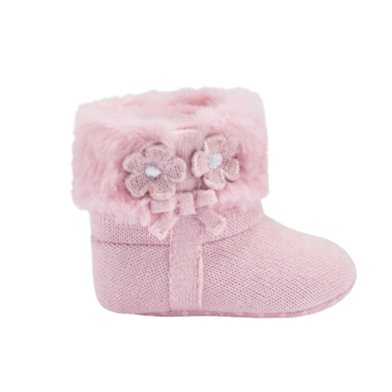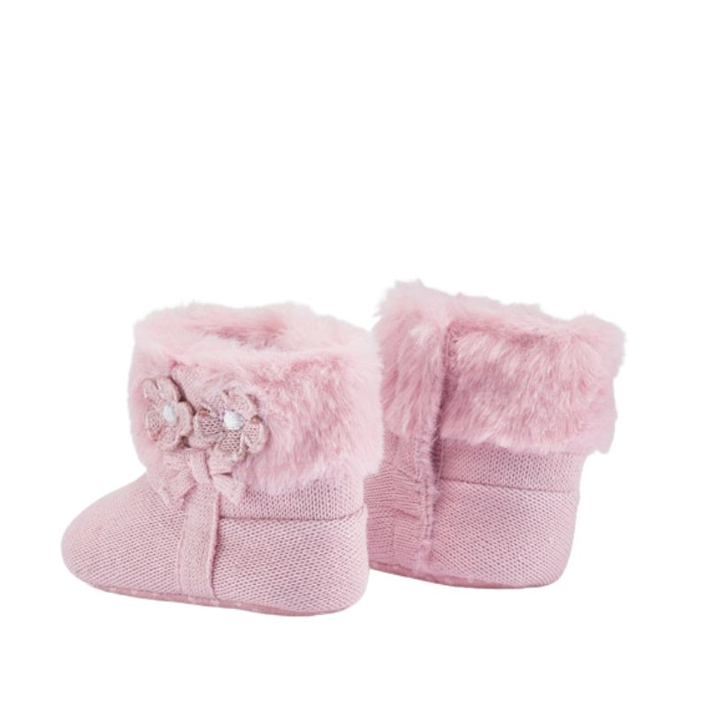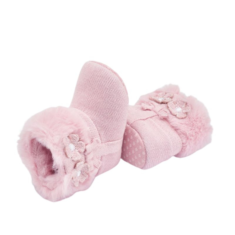 Ghete blanita - RozArticolul se prezinta intr-o cutie din linia Newborn, fiind ideala pentru cadou.Cizme medii, pentru bebelusi, foarte practice pentru protejarea picioarelor in zilele friguroase. Talpa lejera si antiderapanta. Inchiderea reglabila cu velcro asigura o sustinere perfecta a piciorului.Elemente decorative: floricele si fundita atasate.