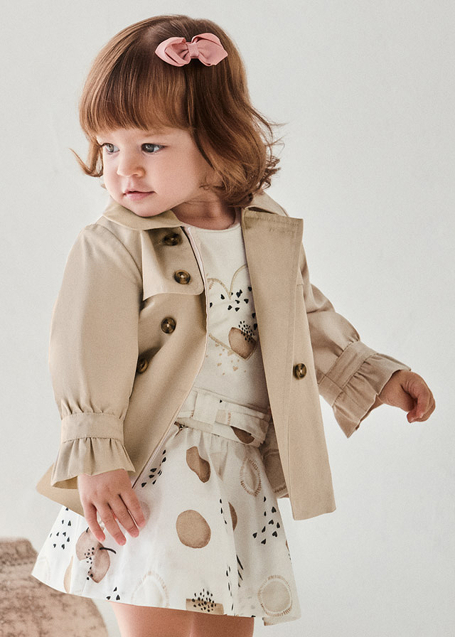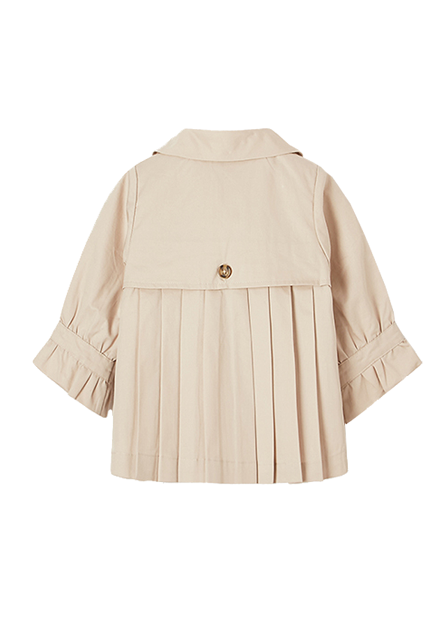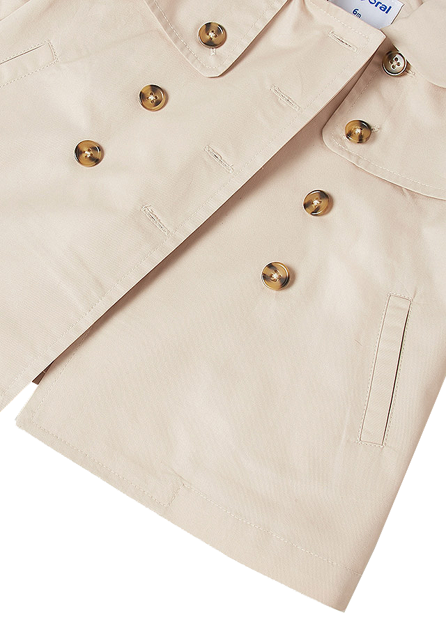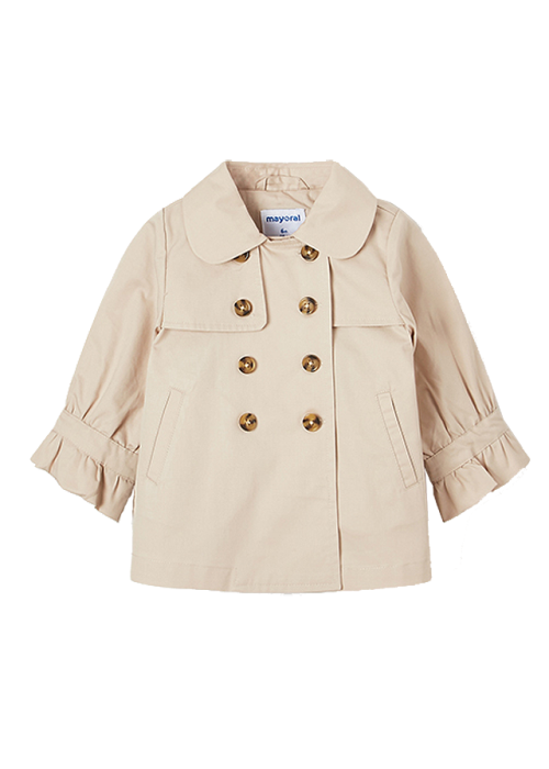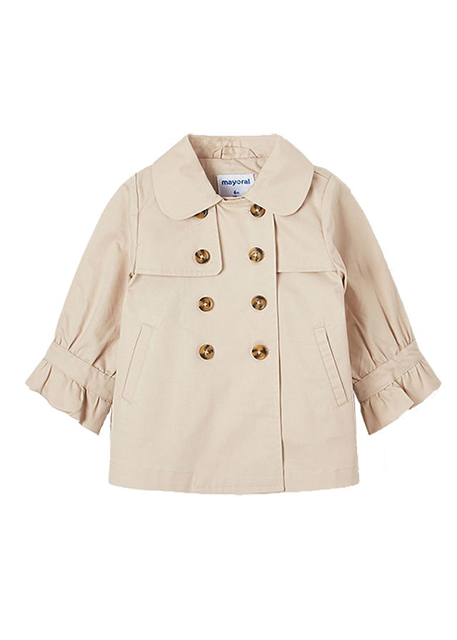 Haina anti vant - Bej, fetitaTrench-ul cu maneca lunga are guler rotund, mansete cu volane, buzunare functionale si inchidere cu 4 nasturi.Pe spate are formate pliuri si 1 nasture. Materialul este din panza rezistenta si clasica anti vant. Elemente decorative: nasturi