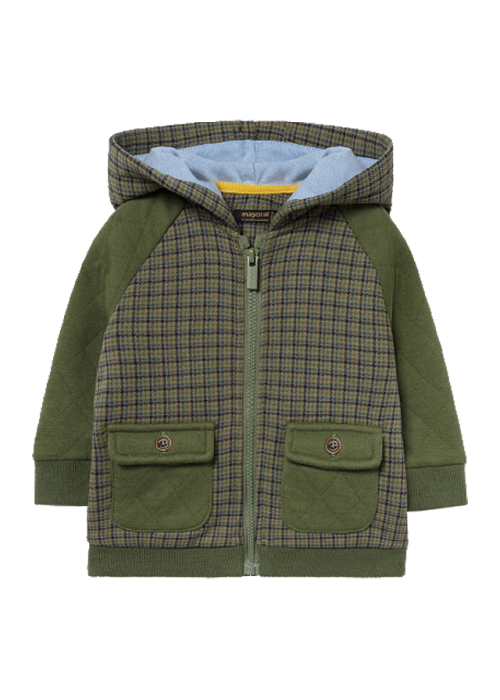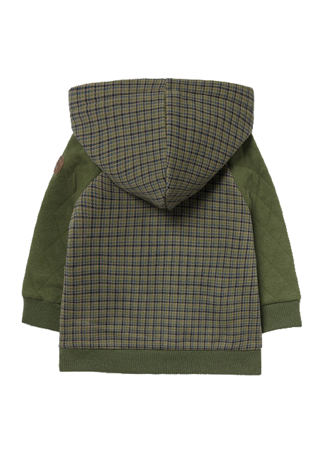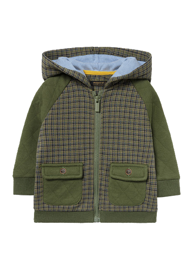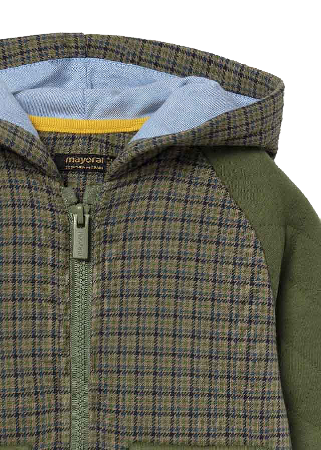 Hanorac combinat - Kaki Jacheta are maneci matlasate si guler cu gluga. Inchiderea se realizeaza cu fermoar pe partea frontala, iar buzunarele au clapa cu nasturi, functionale.Material din plus care ofera confort, moale si placut la atingere.Material: 50% poliester / 49% bumbac / 1% elastan