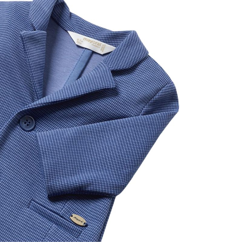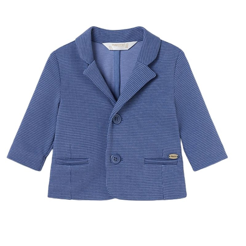 Jacheta cu maneca lunga pentru baiat nou-nascut, are un guler cu rever si inchidere cu nasturi pe partea din fata si buzunare.