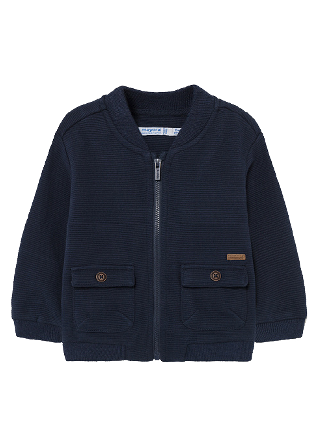 Jacheta tricot - BleumarinJacheta cu maneca lunga si mansete elastice pentru baieti are gulerul bomber si inchidere centrala cu fermoar. Aceasta are tiv cu elastic pentru o mai buna ajustare, iar buzunarele sunt functionale pe partea frontala.Material: 59% bumbac / 40% poliester / 1% elastan