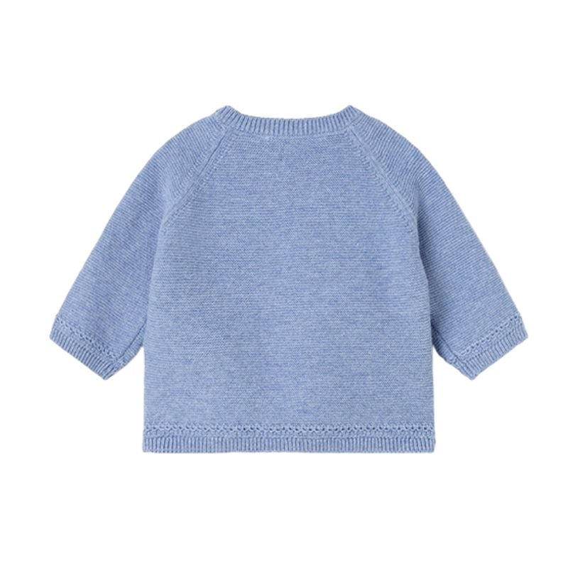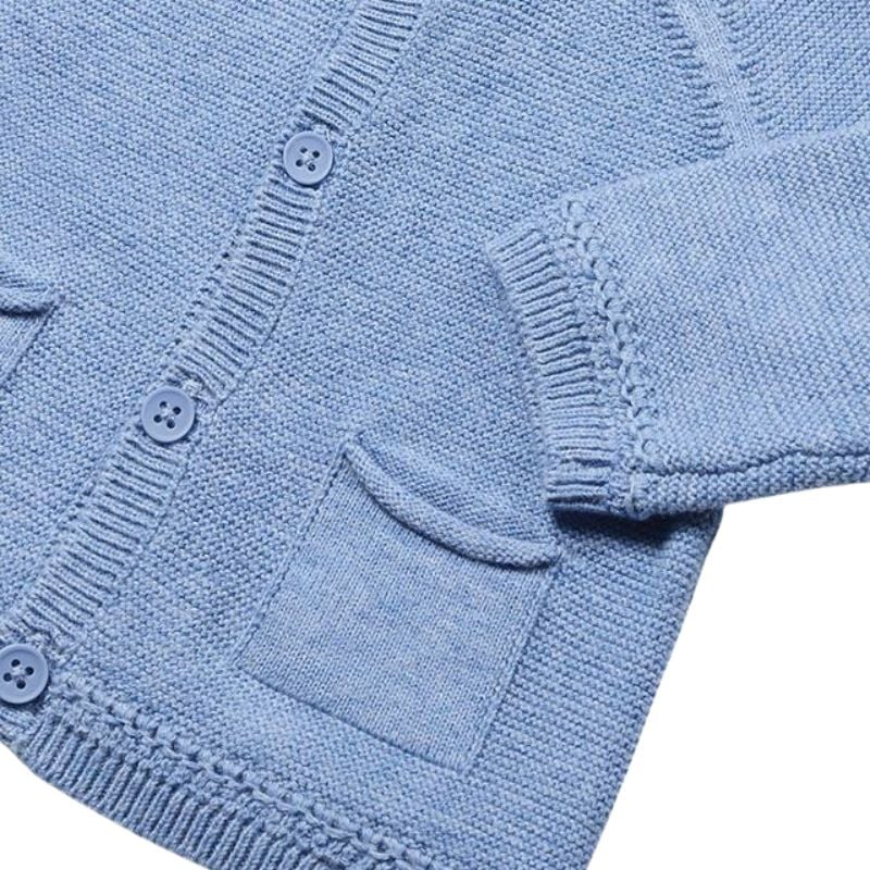 Jacheta bleu tricotata cu bumbac sustenabil ECOFRIENDSJacheta tip cardigan cu maneca lunga are gulerul rotund si inchidere cu nasturi bej pe partea frontala.Buzunare atasate.Material: 100% bumbac Culoare: bleuIntretinere: Spalare: automata / manuala, cu detergent pentru rufe delicate Temperatura: max. 30°C SCoarcere: automata la un numar mediu de rotatii/minut / manuala Interzis: albirea, curatarea chimica si uscarea la tambur Uscare: lasati la uscat pe o suprafata plata Calcare: max. 150°C