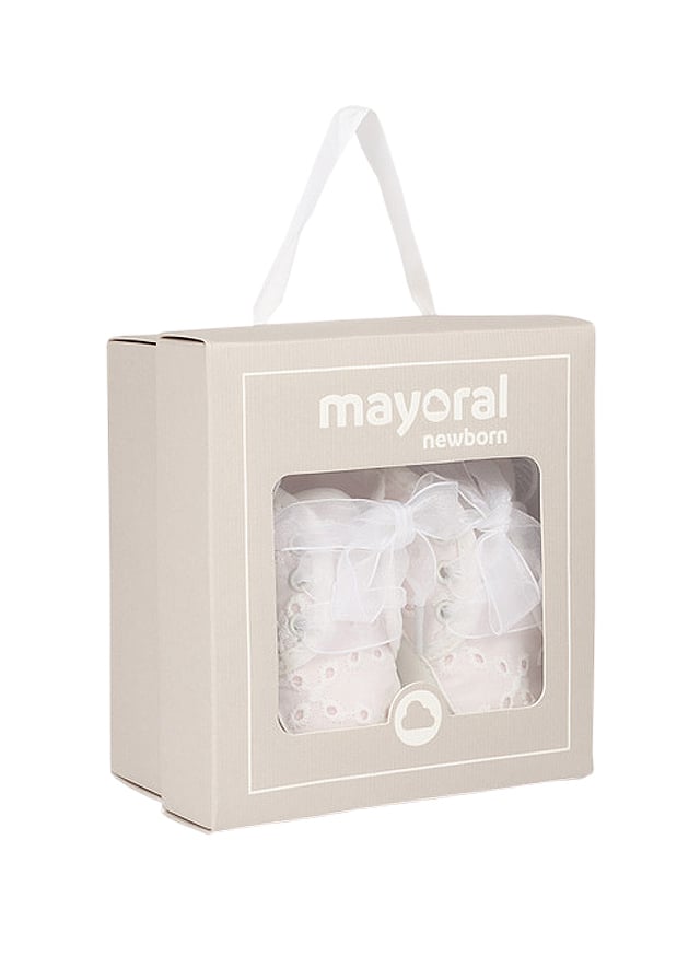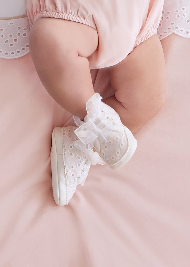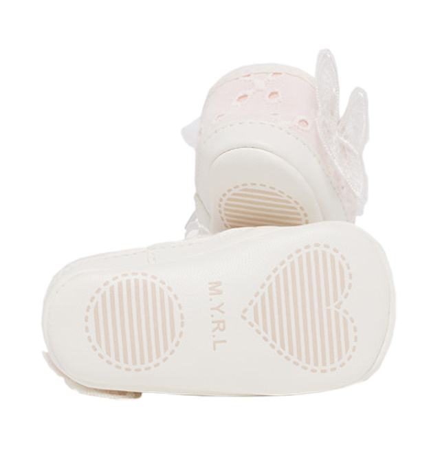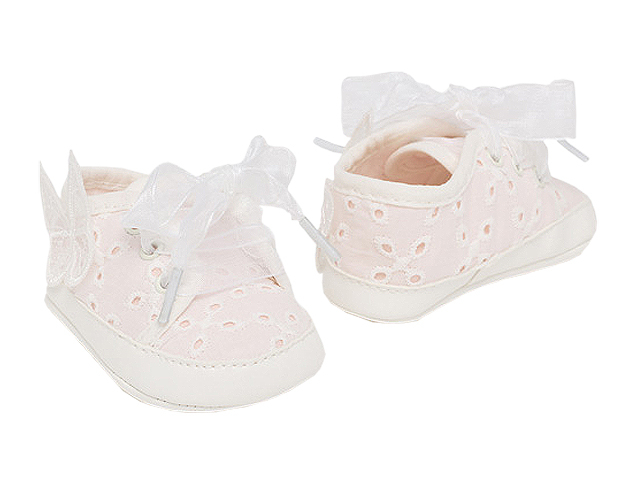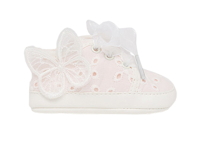 Pantofi sport perforati nou-nascutPantofi sport din panza brodata cu fundita si fluturas atasat. Incaltamintea are interiorul captusit si brant din bumbac respirabil. Acestia au invelisul exterior cu efect lacuit si inchidere cu banda, tip arici, reglabila, care garanteaza o prindere perfecta a piciorului.Produsul se prezinta intr-o cutie din linia Newborn, ideala pentru cadou.