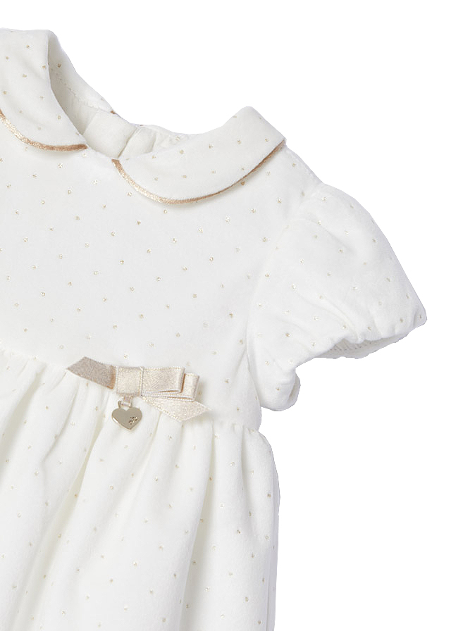 Rochie catifea + boneta - Alb bejSetul cuprinde: - rochita - bonetaRochitaRochita cu maneci scurte si bufante, are gulerul rotund tip camasa si se inchide cu fermoar invizibil pe spate, pentru a facilita imbracarea bebelusului.