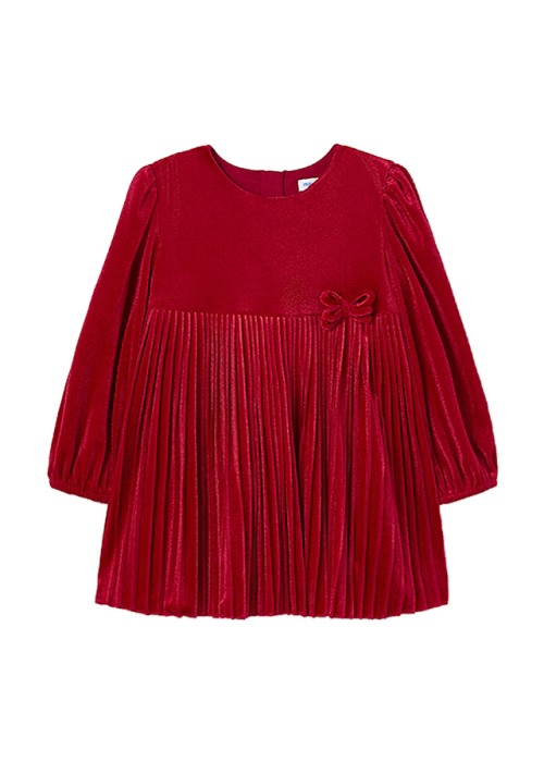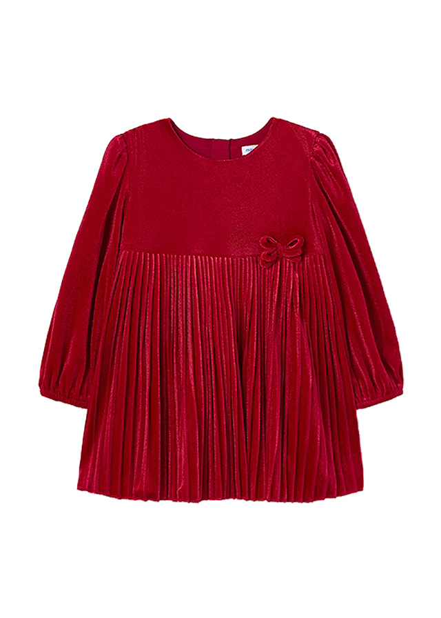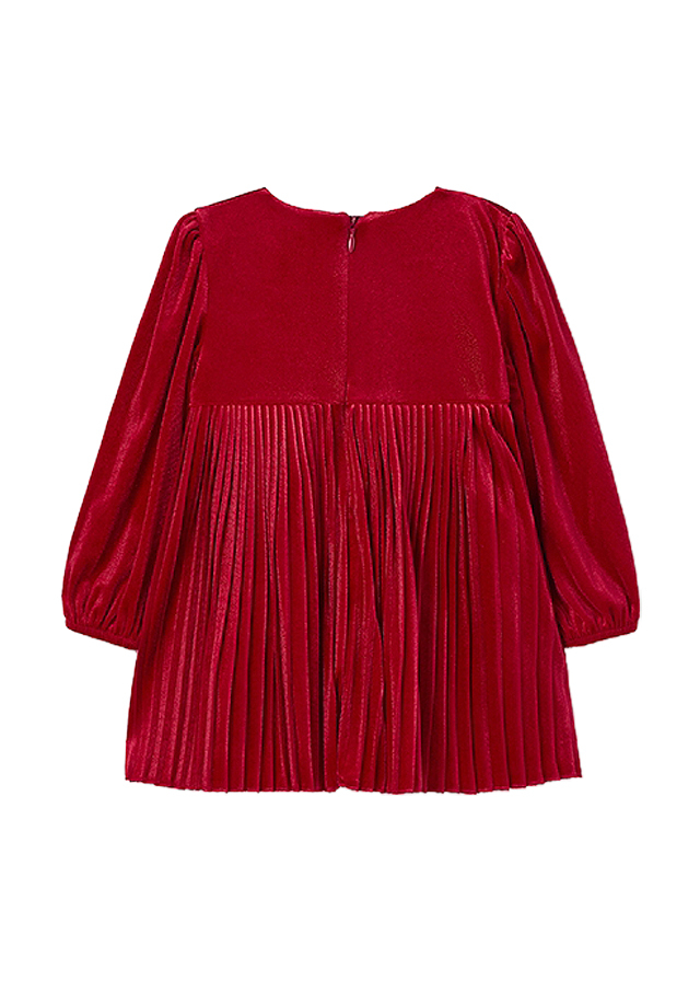 Rochie catifea pliuri - RosuRochita cu maneci lungi si bufante, are gulerul rotund si se inchide cu fermoar invizibil pe spate, pentru a facilita imbracarea bebelusului. Fusta este plisata.Este fabricat din material de catifea eleganta si clasica.