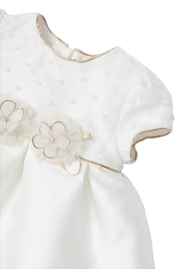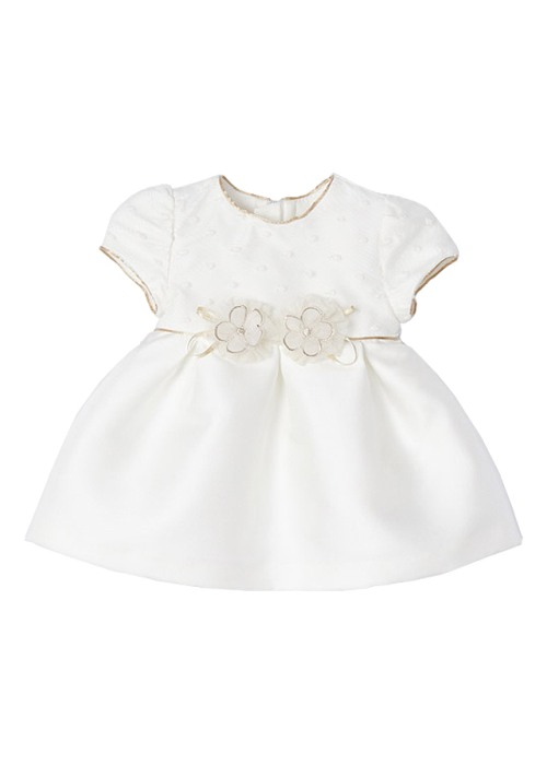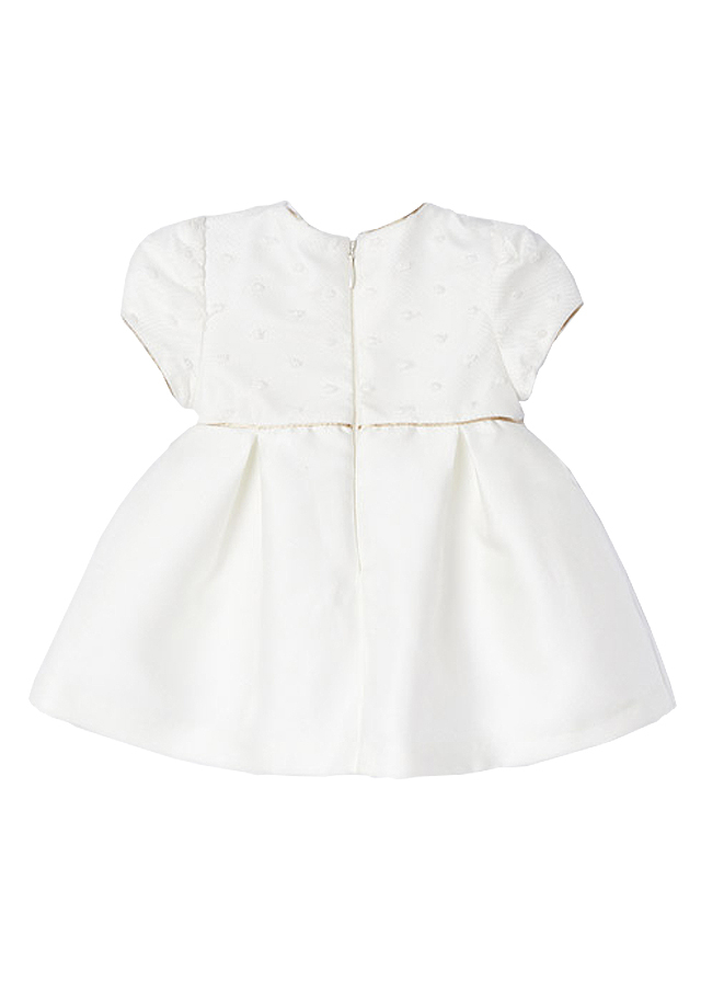 Rochie ceremonie jacard - AlbRochita cu maneca scurta are guler rotund cu volanas, iar inchiderea pe spate cu fermoar invizibil.