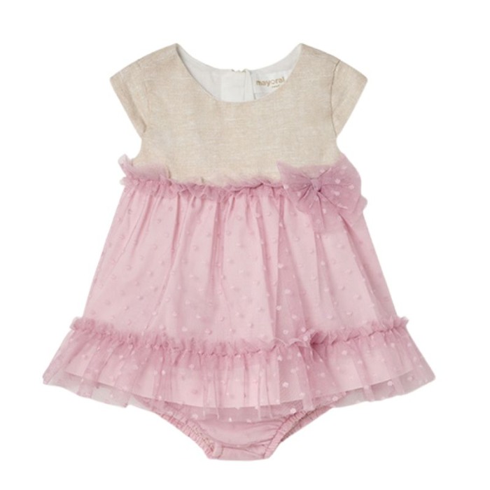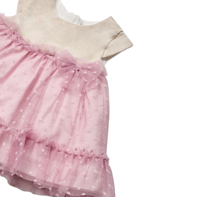 Rochie ceremonie - Tul + chiloteiSetul cuprinde: - rochie - chiloteiRochitaRochita are un guler rotund, iar inchiderea ei se face cu fermoar pe spate, pentru a usura imbracarea acesteia.Este fabricata din material de tul, vaporos, apartinand liniei noastre elegante si exclusive destinata pentru ocaziile speciale. Bust bej si fusta roz pudrat. In talie rochia are un volanas subtire si o fundita aplicata. Materialul fustei este transparent si are insertii cu buline.Material: rochie - 75% Poliester 14% In 11% Bumbac captuasala - 100% BumbacCuloare: alb / crem/roz pudratIntretinere: