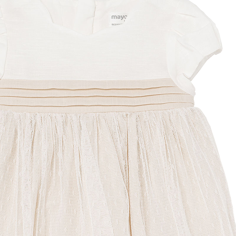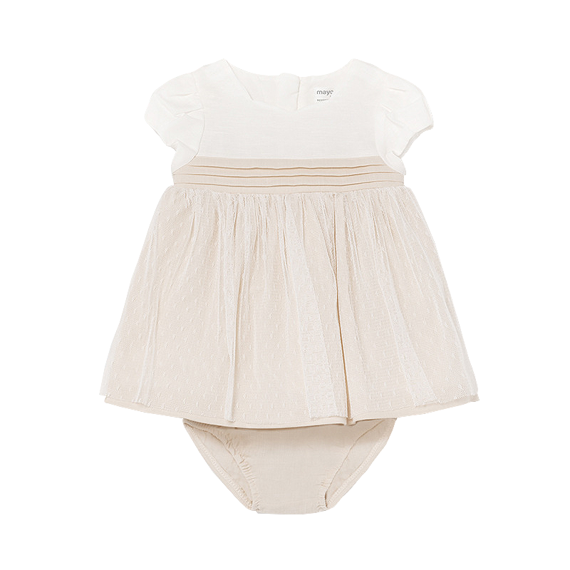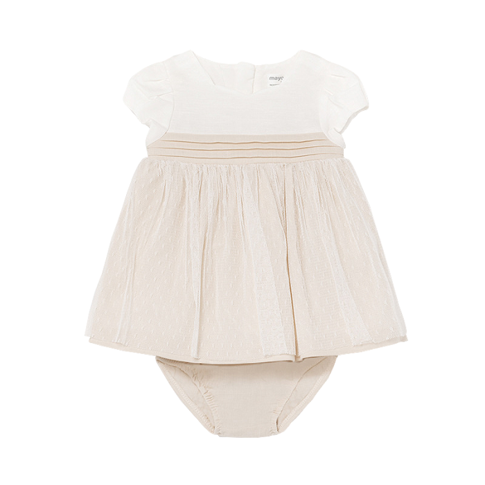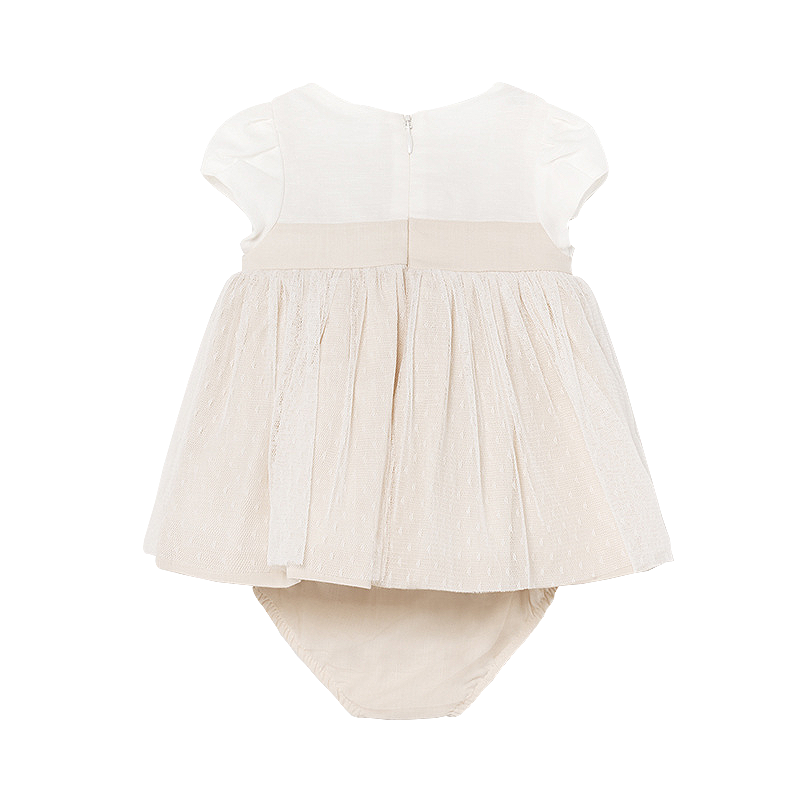 Rochie ceremonie - Tul + chiloteiSetul cuprinde: - rochie - chiloteiRochitaRochita are un guler rotund, iar inchiderea ei se face cu fermoar pe spate, pentru a usura imbracarea acesteia.Este fabricata din material de tul, vaporos, apartinand liniei noastre elegante si exclusive destinata pentru ocaziile speciale. Material: rochie - 66% bumbac / 27% poliamida / 7% in captuasala - 60% bumbac / 40% poliamidaCuloare: alb / cremIntretinere:
