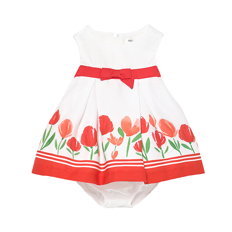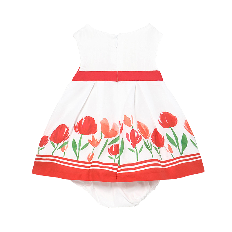 Material: rochie - 100% bumbac captuseala - 100% bumbac chilotel - 100% bumbacCuloare: alb / rosuImprimeu: laleleIntretinere: