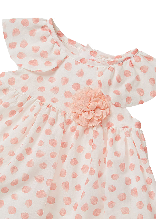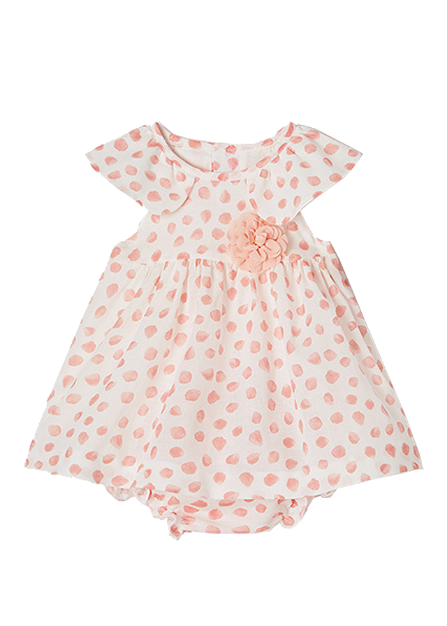 - chilotei Rochita fara maneci are gulerul rotund, iar inchiderea se face cu nasturi pe spate, pentru a usura imbracarea ei.Model este incretit in talie, avand o floare aplicata.Chiloteii au talie reglabila si se asorteaza perfect cu rochita.Material fiind fluid si elastic pentru un confort maxim.Material: rochie - 100% bumbac captuseala - 100% bumbac chilotel - 100% bumbacCuloare: alb / coraiImprimeu: petale floriIntretinere: