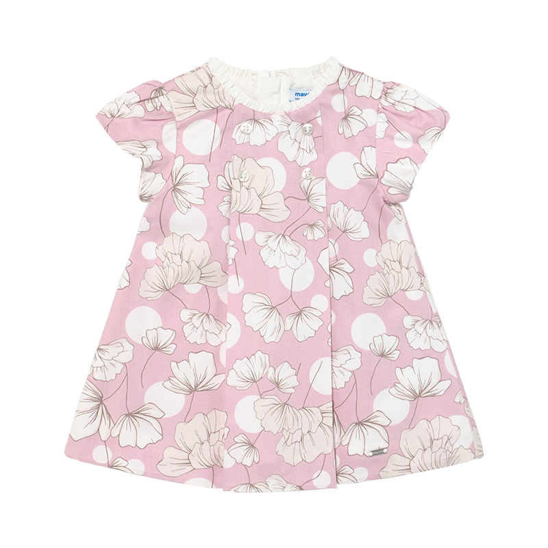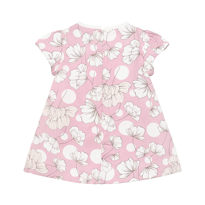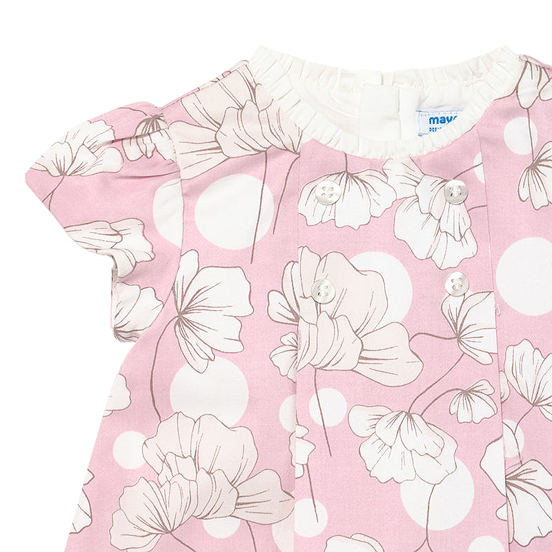 Rochie cu imprimeu floral Rochita cu maneca scurta are gulerul rotund cu volanas, iar inchiderea pe spate cu fermoar invizibil. Materialul este satinat, elegant si luminos. Modelul este incretit si captusit. Elemente decorative: nasturi. Imprimeu cu decor floral.Material: exterior - 96% bumbac / 4% elastan captuseala - 100% bumbacCuloare: rozImprimeu: floriIntretinere: