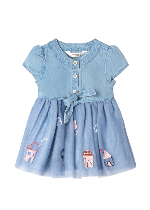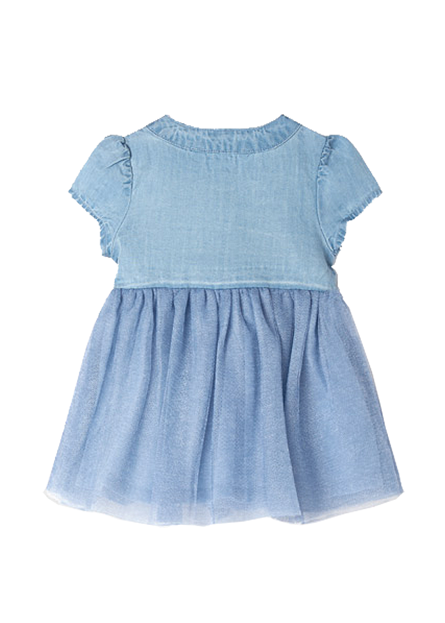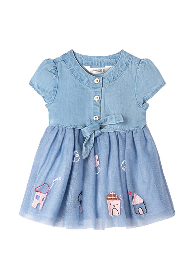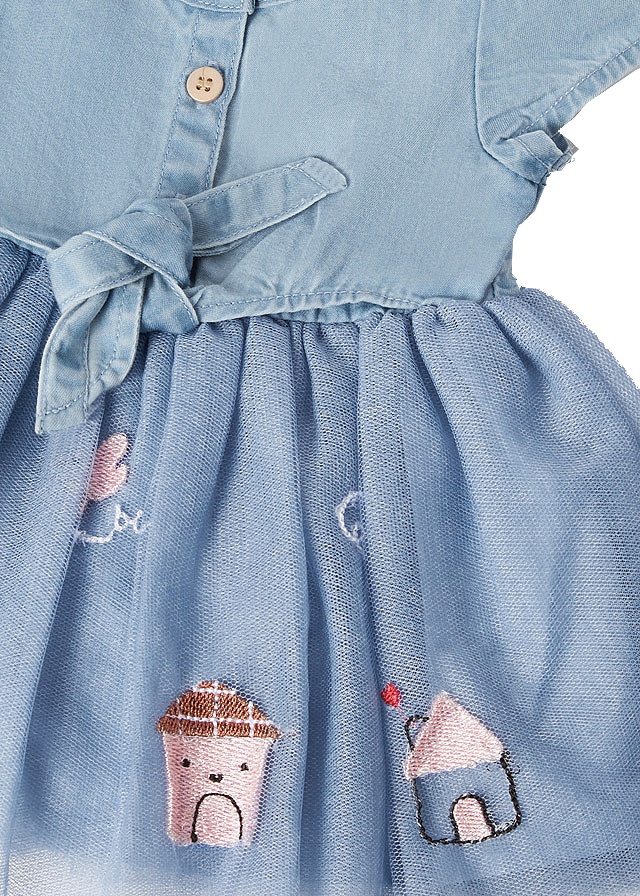 Rochie cu tulRochita are maneca scurta, guler rotund, iar inchiderea se face cu nasturi pe fata, pentru a usura imbracarea ei.Model este incretit in talie, avand deaspra tul cu broderie.Elemente decorative: aplicatie casute.Material: rochie - 100% bumbac tul - 60% poliester / 26% bumbac / 14% lyocellCuloare: albastruImprimeu: aplicatii casuteIntretinere: