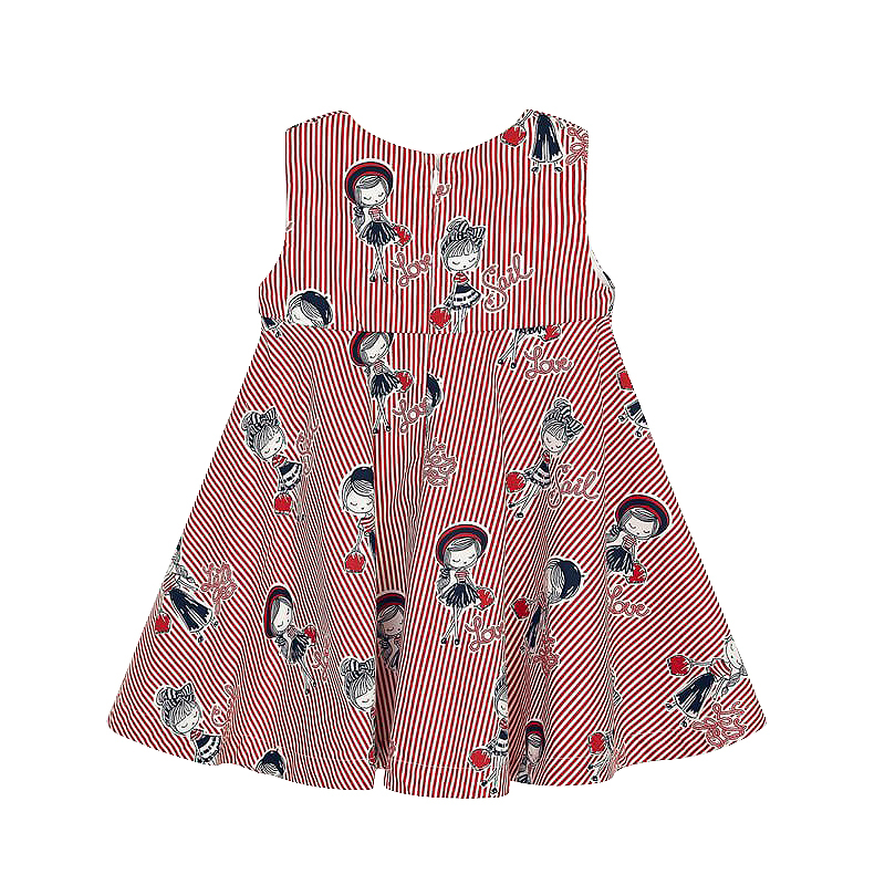 Rochie desene - PapusiRochia nu are maneci, iar inchiderea se face pe spate, cu fermoar invizibil. Designul are imprimeu cu dungi alb-rosu si papusi la moda. Are un nod decorativ in partea de sus, iar partea de jos a rochiei este closat.