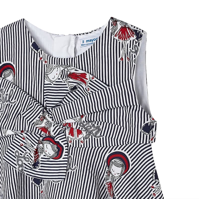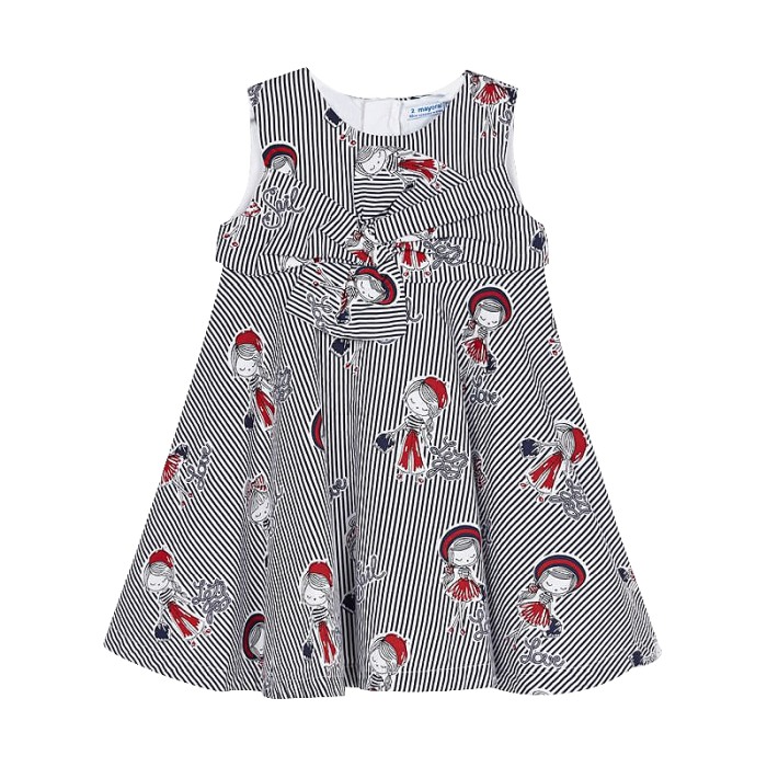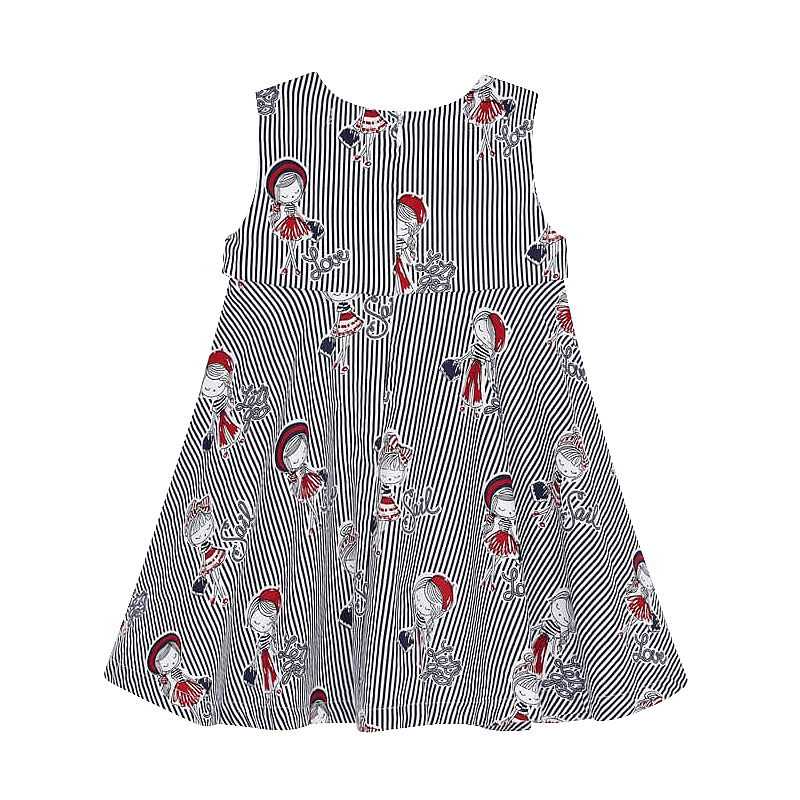 Designul are imprimeu cu dungi alb-albastru si papusi la moda.
