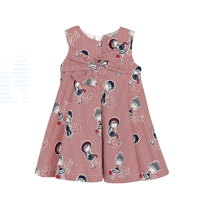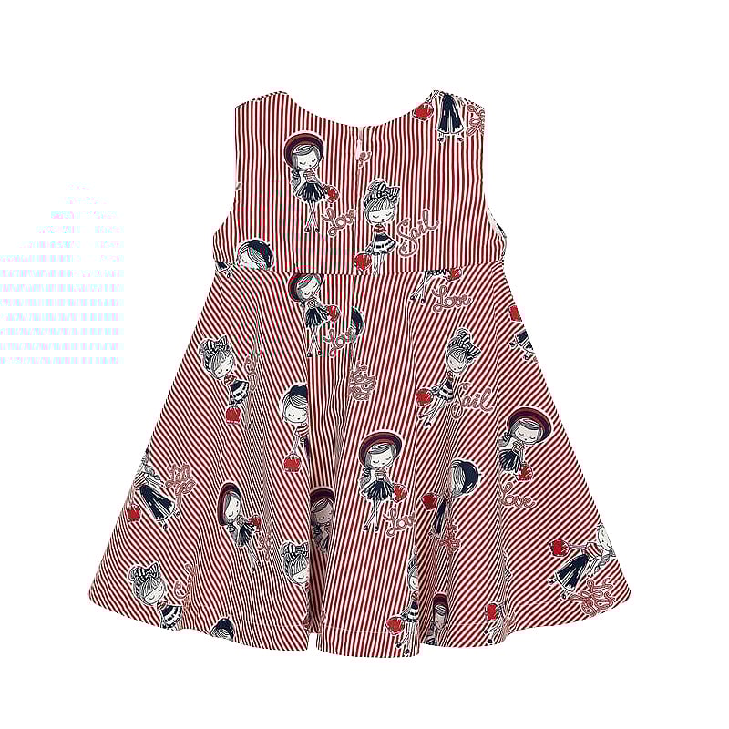 Rochie desene - PapusiRochia nu are maneci, iar inchiderea se face pe spate, cu fermoar invizibil. Designul are imprimeu cu dungi alb-rosu si papusi la moda. Are un nod decorativ in partea de sus, iar partea de jos a rochiei este closat.