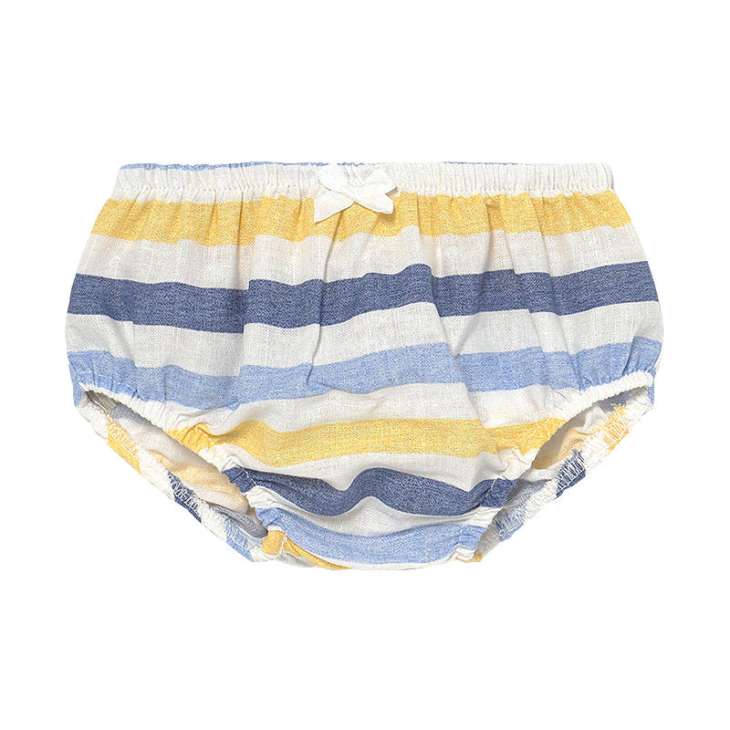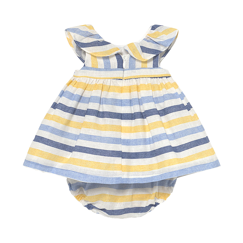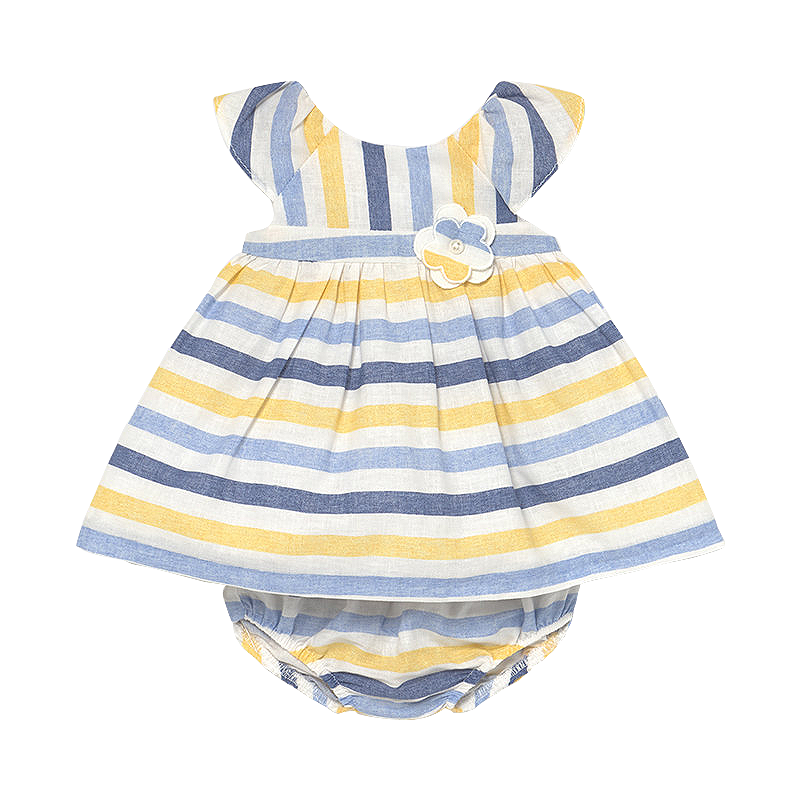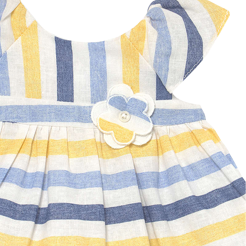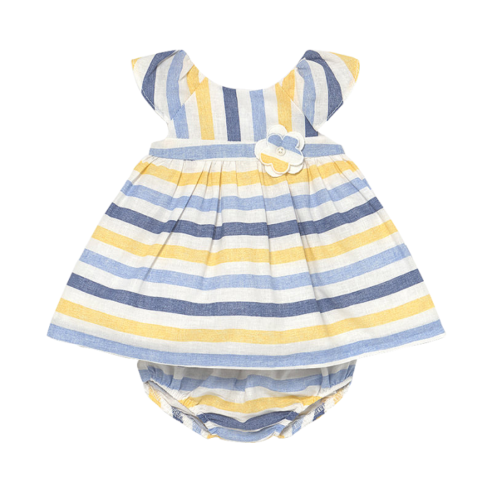 Chiloteii au talia reglabila. Elemente decorative: fundita. Design: dungi.Material: rochie -  68% bumbac / 32% in                  captuseala - 100% bumbac                  chilotei - 68% bumbac / 32% inCuloare: alb / albastru / galben / bleumarinImprimeu: dungi Intretinere: