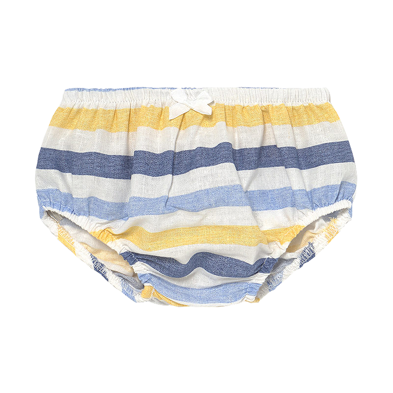 Chiloteii au talia reglabila. Elemente decorative: fundita. Design: dungi.Material: rochie - 68% bumbac / 32% in captuseala - 100% bumbac chilotei - 68% bumbac / 32% inCuloare: alb / albastru / galben / bleumarinImprimeu: dungi Intretinere: