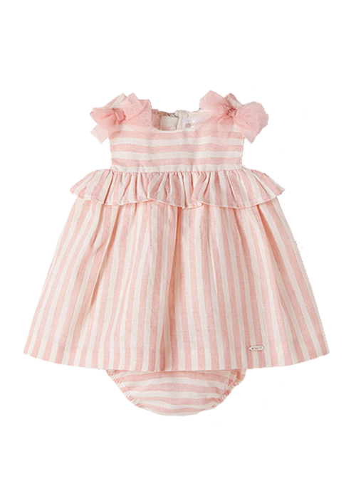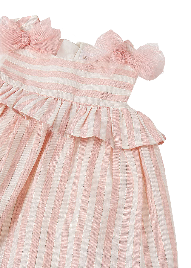 - chilotei Rochita fara maneci are gulerul rotund, iar inchiderea se face cu fermoar pe spate, pentru a usura imbracarea ei.Model este incretit in talie, avand un volan aplicat.Pe umeri sunt aplicate doua fundite din tul.Chiloteii au talie reglabila si se asorteaza perfect cu rochita.Material fiind fluid si elastic pentru un confort maxim.Material: rochie - 44% in / 39% bumbac / 15% poliester / 2% fibre metalice                   captuseala - 100% bumbac                    chilotel - 44% in / 39% bumbac / 15% poliester / 2% fibre metaliceCuloare: alb / coraiImprimeu: dungi si insertii argintii fineIntretinere: