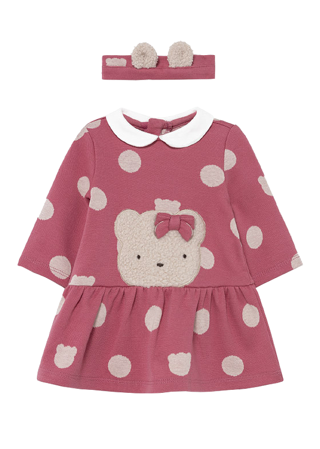 Rochie ECOFRIENDS cu buline + bentita Rochita are guler tip camasa, iar inchiderea se face cu fermoar pe spate, pentru a usura imbracarea ei.Aceasta are croaiala pe solduri si are o aplicatie ursulet.Elemente decorative: funditaBentita de par este elastica.Poti combina acest accesoriu cu orice tip de look.Elemente decorative: urechiuseMaterial: rochie - 81% bumbac / 17% poliester / 2% elastan bentita - 80% bumbac / 18% poliester / 2% elastanCuloare: rosu / albIntretinere: Spalare: automata / manuala Temperatura: max. 30°C