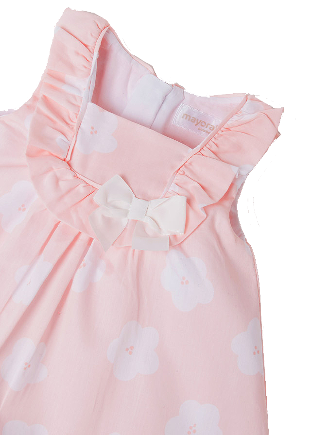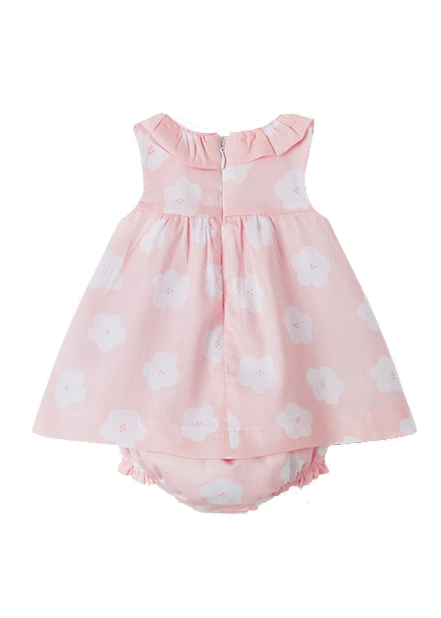 Rochie florice ECOFRIEND + chilotei - RozSetul cuprinde: - rochita - chilotei Rochita fara maneci are gulerul patrat, iar inchiderea se face cu fermoar pe spate, pentru a usura imbracarea ei.Modelul este incretit in talie, avand in jurul gulerului aplicat un volan si o funda.