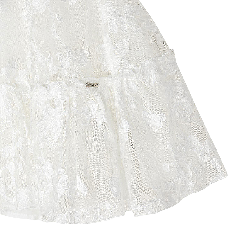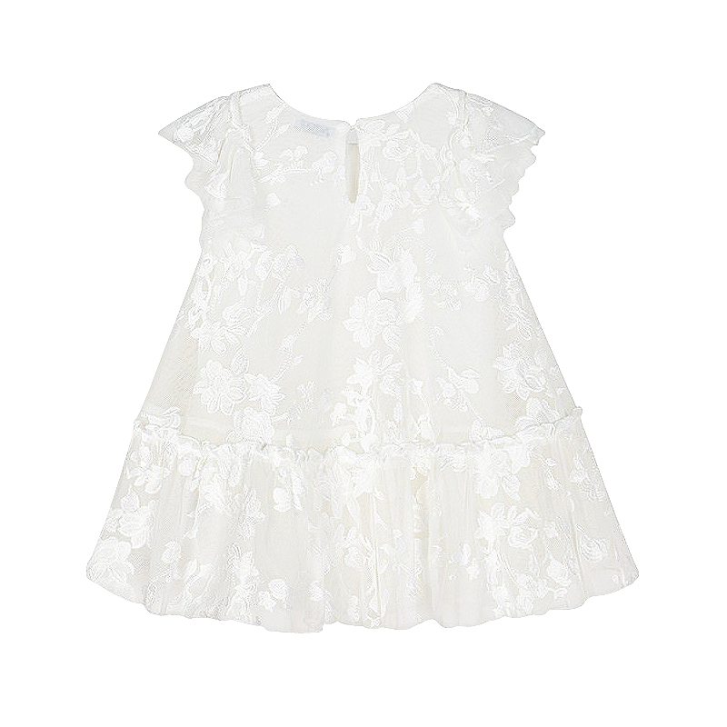 Rochie tul brodat - Alb Floral Rochita fara maneci are un guler rotund, iar la spate, are o mica deschidere pentru inchiderea cu nasture, pentru a usura imbracarea acesteia.Rochia are la umeri si in partea de jos, aplicate volane, deasemeni aceasta fiind si captusita.Este fabricata din material de tul brodat, vaporos, apartinand liniei noastre elegante si exclusive destinata pentru ocaziile speciale. Material: rochie - 62% poliamida / 31% viscoza / 7% bumbac                  captuasala - 72% bumbac / 28% poliesterCuloare: albDesign: flori brodateIntretinere: