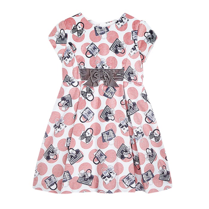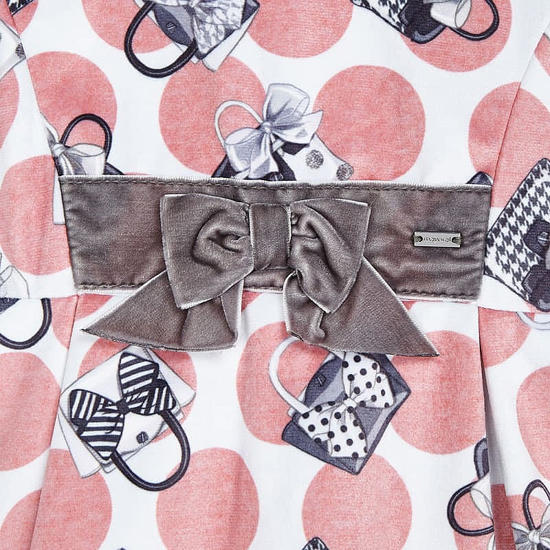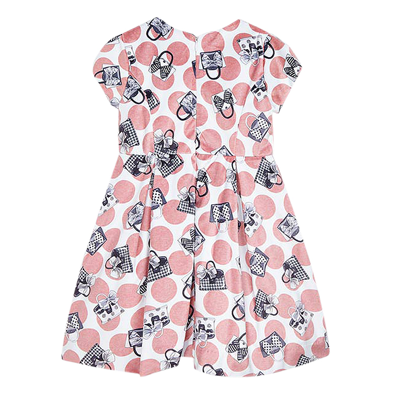 Rochita catifea - gentuteRochita cu maneca scurta are gulerul rotund si inchidere cu fermoar invizibil pe partea din spate, pentru a usura imbracarea.Materialul este de catifea eleganta si clasica. Modelul are volum, elemente decorative si imprimat cu gentute.Elemente decarative: funditaMaterial: exterior