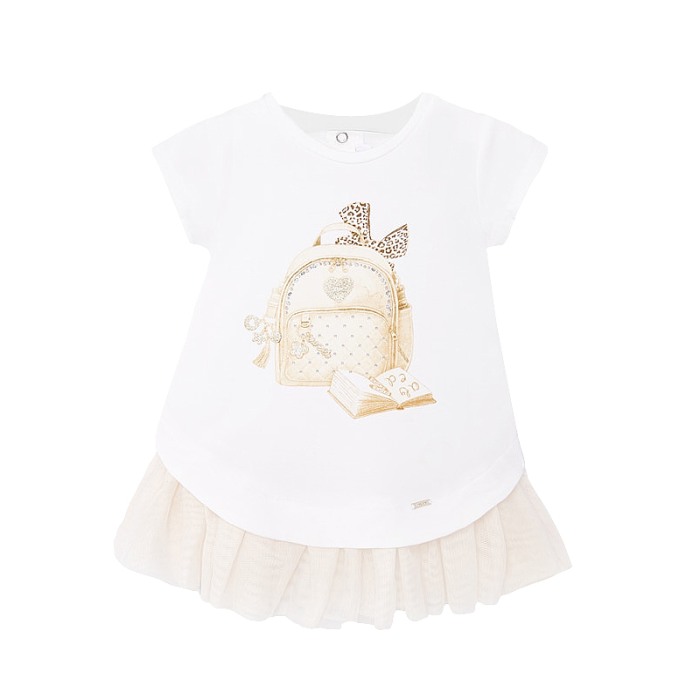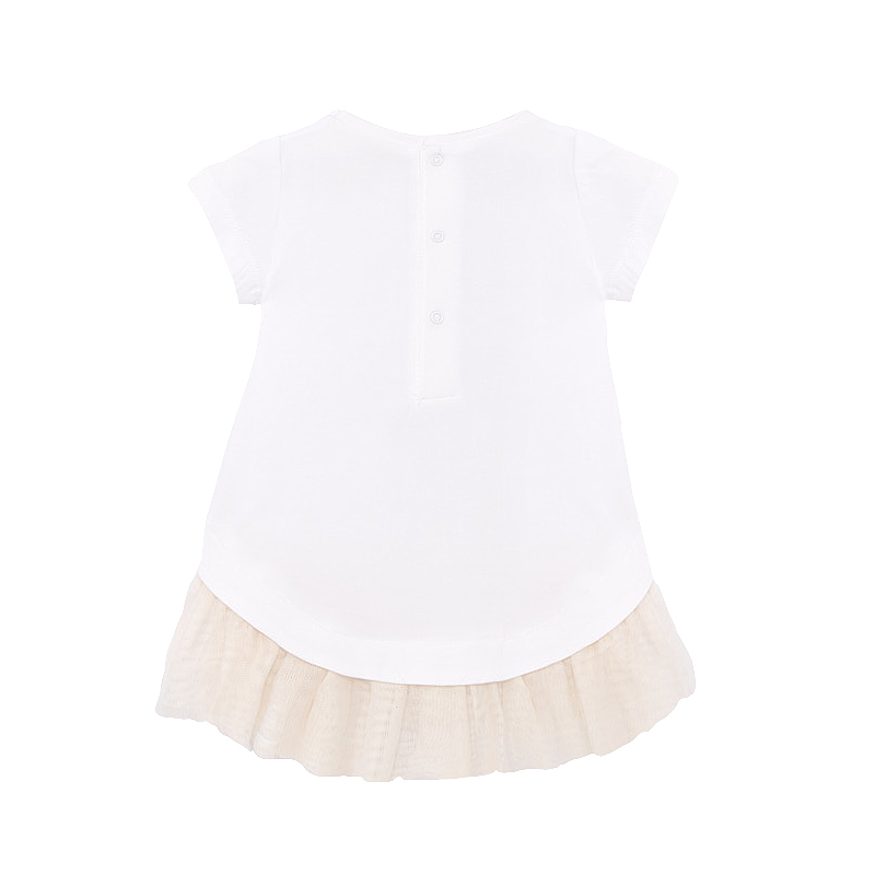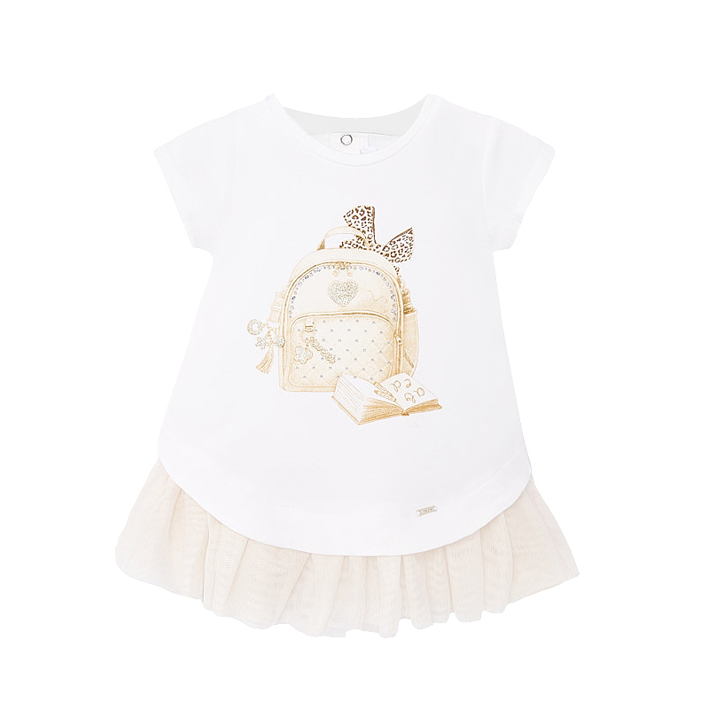 Rochita tul - BejRochita cu maneca scurta are gulerul rotund si inchiderea prin capse pe partea din spate, pentru a usura imbracarea. Materialul este moale din bumbac elastic si tul. Elemente decorative: desen pe partea frontala, sclipici.Material: 92% bumbac / 5% poliester / 3% elastanCuloare: alb / bejImprimeu: ghiozdan cu caiet si creioane in nuante de bej + sclipici