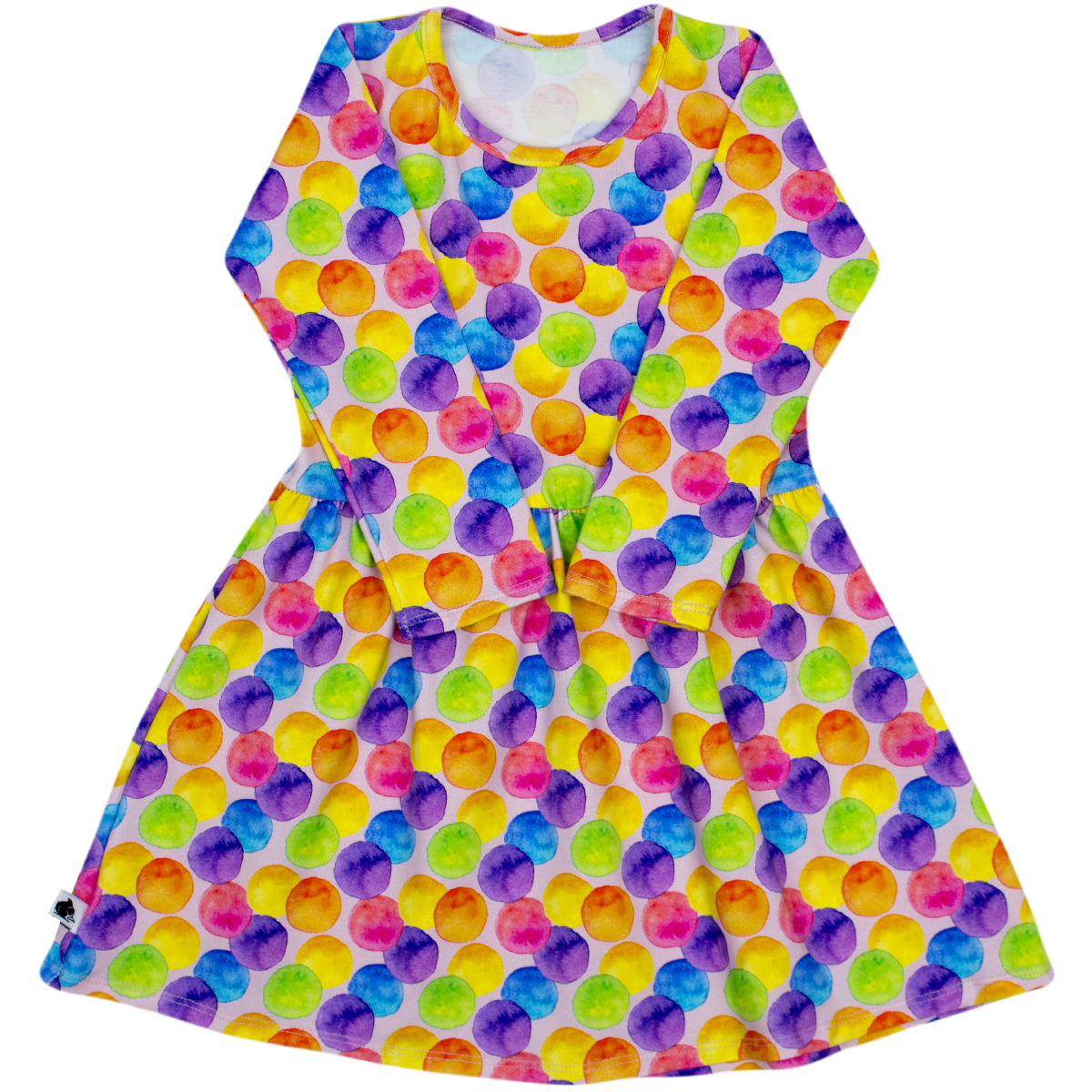 Rochita cu maneca lunga imprimeu buline colorateRochita cu maneca lunga este fabricata dintr-un jersey imprimat. Rochita este la baza gatului iar in talie este prinsa usor cu un elastic pentru a se increti lejer la mijloc. Materialul de calitate, imprimeul vesel cu buline multicolore si croiala ampla , toate vor crea o stare extraordinara de confort copilului .