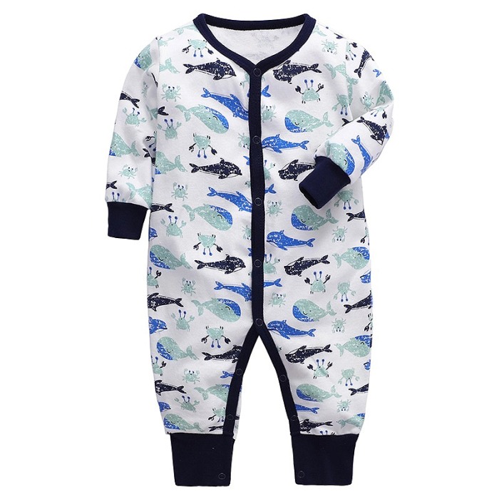 Salopeta (pijama) cu capse - Animale marineSalopeta (pijama) are maneca lunga, un guler rotud si mansete elastice.Inchiderea se face cu capse de calitate, incepand de pe fata salopetei si continuind pe interiorul picioruselor, facilitand o imbracare ușoara și practica a celui mic.Aceasta este imprimata intr-o culoare contrastanta. Imprimarea este realizata dupa o metoda durabila si sigura cu vopsea pe baza de apa, fara substante toxice, pentru a proteja pielea sensibila a bebelusului.Material: 100% bumbacCuloare: alb / bleumarinImprimeu: animale marineIntretinere: