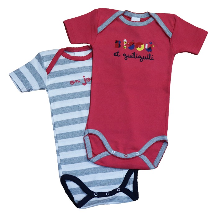 Set 2 body uri cu maneca scurta rosu/alb/griBody-ul se prinde in partea de jos cu trei capse, materialul este de buna calitate, rezistent la spalat, iar culorile se pastreaza in timp.Se poate folosi in toate anotimpurile anului. Material: 100% bumbac Culoare: rosu/alb/griImprimeu: dungi gri si cuburiIntretinere: Spalare: automata / manuala Temperatura: max. 30°C Interzis: albirea si uscarea la tambur Calcare: temperatura medie Fabricat in Romania