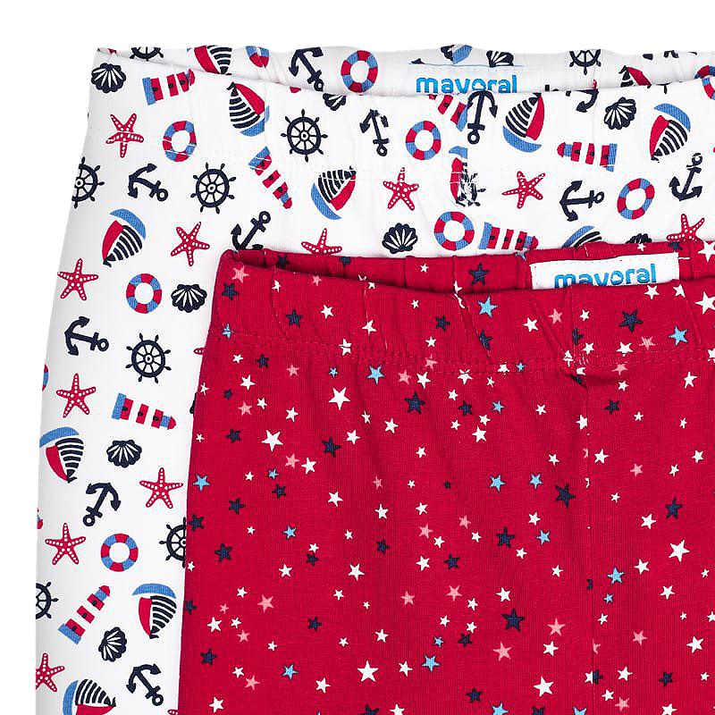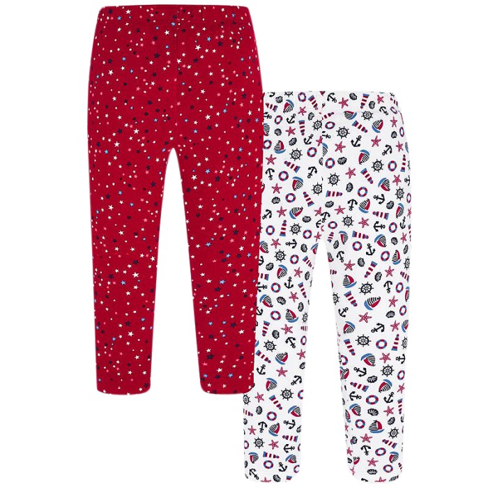 Set 2 Pantaloni tip Colanti Rosu Alb - Mayoral Pantaloni tip colanti, ideali pentru gradinita sau sport, in combinatie cu tricouri sau rochite.Sunt perfecti pentru un look sport sau casual. Material moale din bumbac elastic.Talia este elastica .Material: 83% bumbac / 15% poliester / 2% elastan Culoare: rosu/albImprimeu: stelute/ancore, scoici, barci