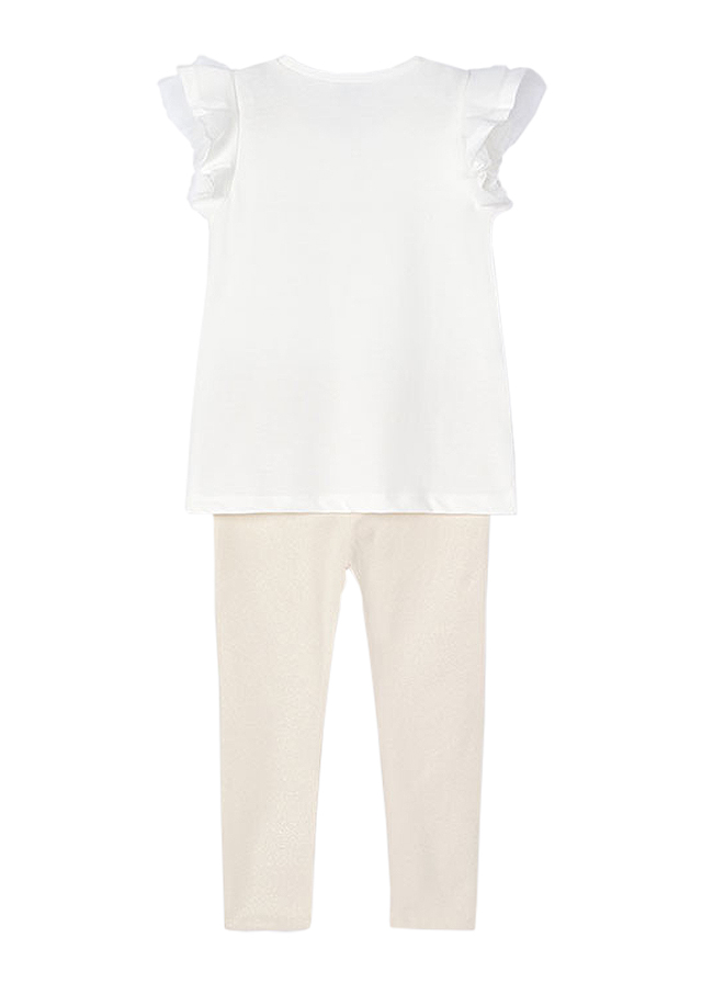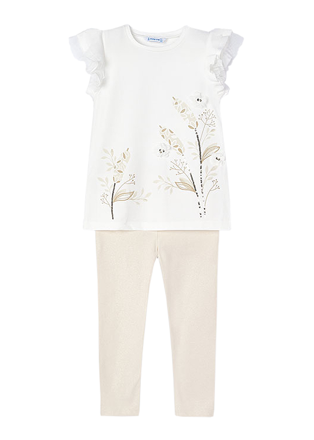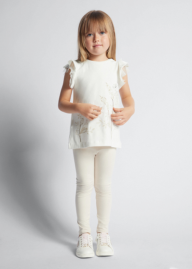 Set 2 piese Girl bluza+pantaloni Better Cotton, bluza+pantaloni - Mayoral Compleul pentru fetita este format din 2 piese: - bluza cu maneca scurta - pantaloniBluza cu maneca scurtaBluza cu maneca scurta are gulerul rotund la baza gatului. Manecutele au volanase din tul.Material moale din bumbac elastic. Elemente decorative: aplicatii florale albe din voal.