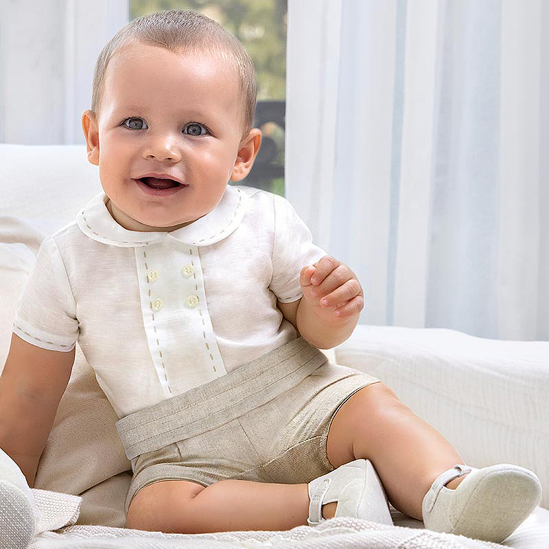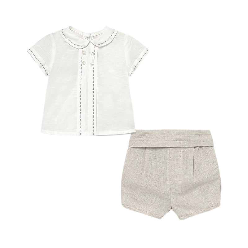 Set 2 piese - Bluza eleganta si pantaloni scurti - MayoralCompleul pentru baieti este format din:    - bluza    - pantaloni scurtiBluzaBluza are maneca scurta, gulerul rotund si se inchide cu nasturi pe tot spatele, pentru a facilita imbracarea bebelusului.