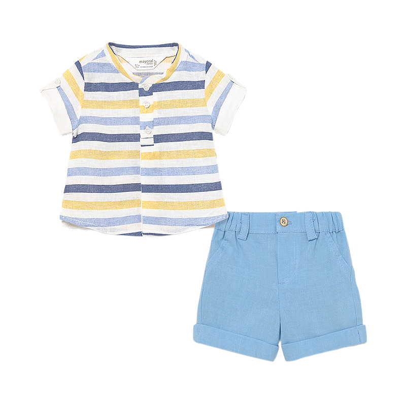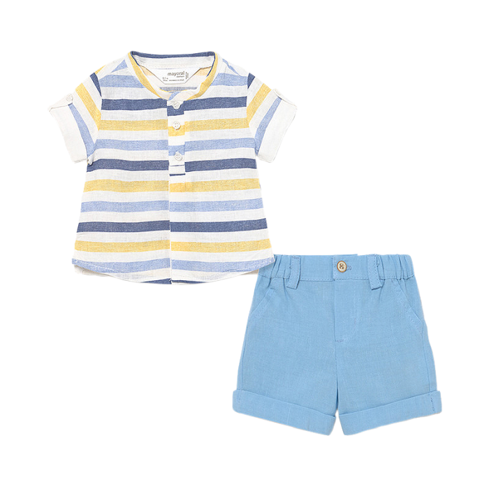 Set 2 piese - Camasa si pantaloni scurti Compleul pentru baieti este format din: - tricou - pantaloni scurtiCamasa Camasa este cu maneca scurta, gulerul rotund si se inchide cu nasturi, pentru a facilita imbracarea bebelusului.