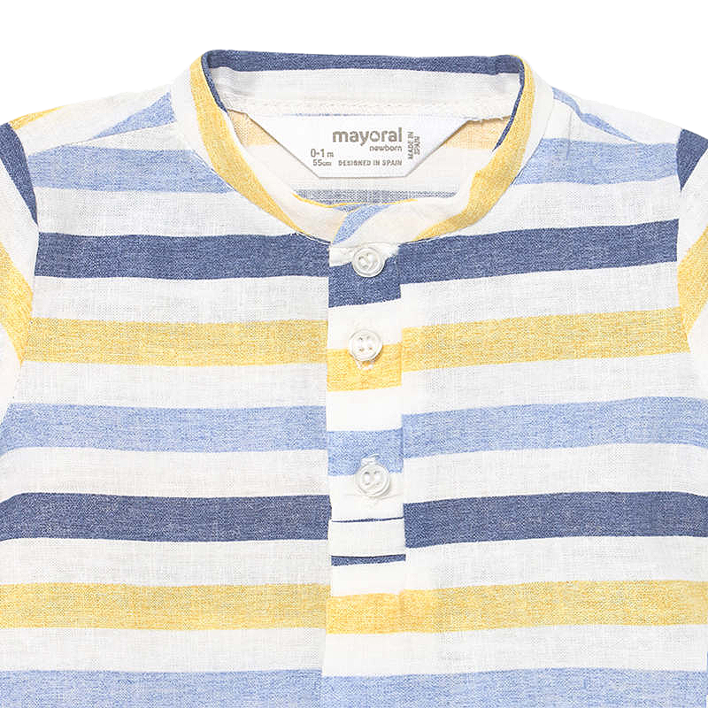 Material: 55% bumbac / 45% inCuloare: alb / bleu / albastru / galbenImprimeu: dungiIntretinere: Spalare: automata / manuala, cu detergent pentru rufe delicate