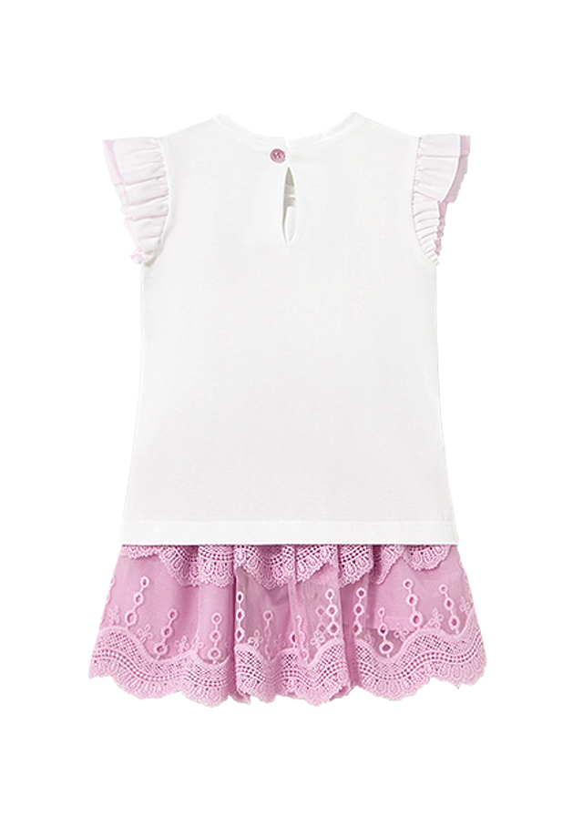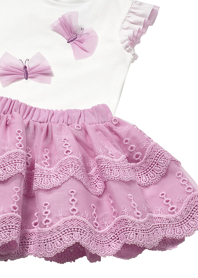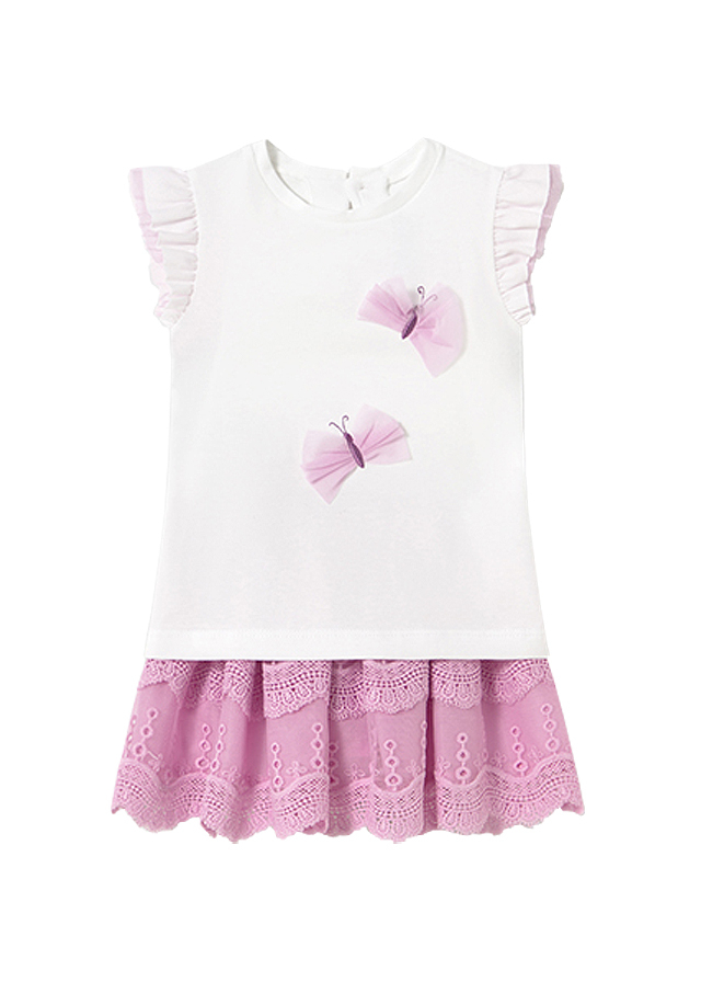 Set 2 piese - Fusta tul brodat+tricou - fluturi Setul pentru fetite este format din: - fusta tul brodat - bluza cu maneca scurtaBluza cu manca scurtaBluza are maneca scurta cu volane si guler rotund. Se inchide cu nasture pe tot spate, pentru a facilita imbracarea bebelusului.Material moale din bumbac elastic.Elemente decorative: aplicatiiMaterial: 95% bumbac / 5% elastan