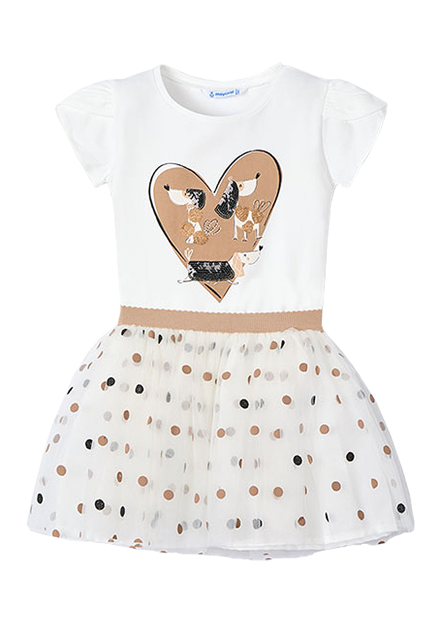 Set 2 piese - Fusta tul+tricou - catei Setul pentru fetite este format din: - fusta - bluza cu maneca scurtaBluza cu manca scurtaBluza cu maneca scurta si guler rotund. Material moale din bumbac elastic.Elemente decorative: broderie cateiMaterial: 95% bumbac / 5% elastan