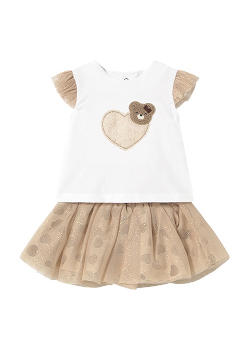 Set 2 piese - Fusta tul+tricou - inimioaraSetul pentru fetite este format din: - fusta tul - bluza cu maneca scurtaBluza cu manca scurtaBluza cu maneca scurta cu tul si guler rotund. Material moale din bumbac elastic.Elemente decorative: broderie Material: 90% bumbac / 5% elastan / 5% poliester