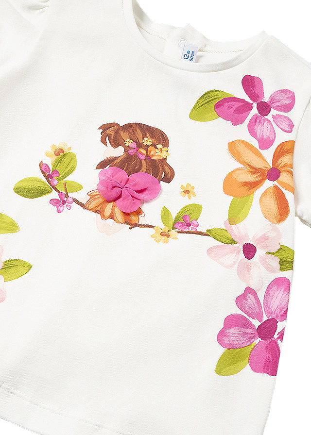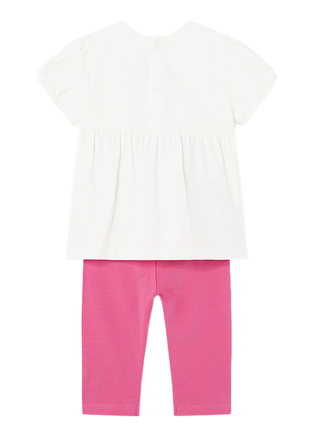 Set 2 piese Girl bluza+pantaloni Better Cotton, bluza+pantaloni - Mayoral Compleul pentru fetita este format din 2 piese: - bluza cu maneca scurta - pantaloniBluza cu maneca scurtaBluza cu maneca scurta are gulerul rotund la baza gatului.Material moale din bumbac elastic. Elemente decorative: desen pe partea frontala, aplicatii.
