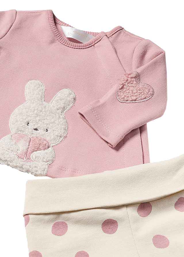 Bluza cu maneca lunga are gulerul rotund, iar inchiderea se face cu capse fata - lateral , pentru a facilita imbracarea bebelusului.Elemente decorative: aplicatie iepure din blanita cu fundita.Material: 88% bumbac / 7% poliester / 5% elastanCuloare: rozImprimeu: iepuras / inimoareIntretinere: Spalare: automata / manuala Temperatura: max. 30°C Stoarcere: automata (numar mediu de rot/min) / manuala Interzis: albirea, curatarea chimica si uscarea la tambur Uscare: pe umeras, lasand apa sa se scurga Calcare: max. 110°CPantaloni cu botoseiAcesti pantaloni sunt confortabili, rezistenti si practici pentru ca acopera piciorusul si nu are nevoie de sosete.In talie are o banda elastica moale. Material usor pufos in interior pentru a tine mai bine caldura.Ideali in primele luni de viata.Sunt de nelipsit din dulapul unui bebelus.Material: 95% bumbac / 5% elastanCuloare: bej/ rozImprimeu: bulineIntretinere: Spalare: automata / manuala Temperatura: max. 30°C Stoarcere: automata (numar mediu de rot/min) / manuala Interzis: albirea, curatarea chimica si uscarea la tambur Uscare: pe umeras, lasand apa sa se scurga Calcare: max. 110°C