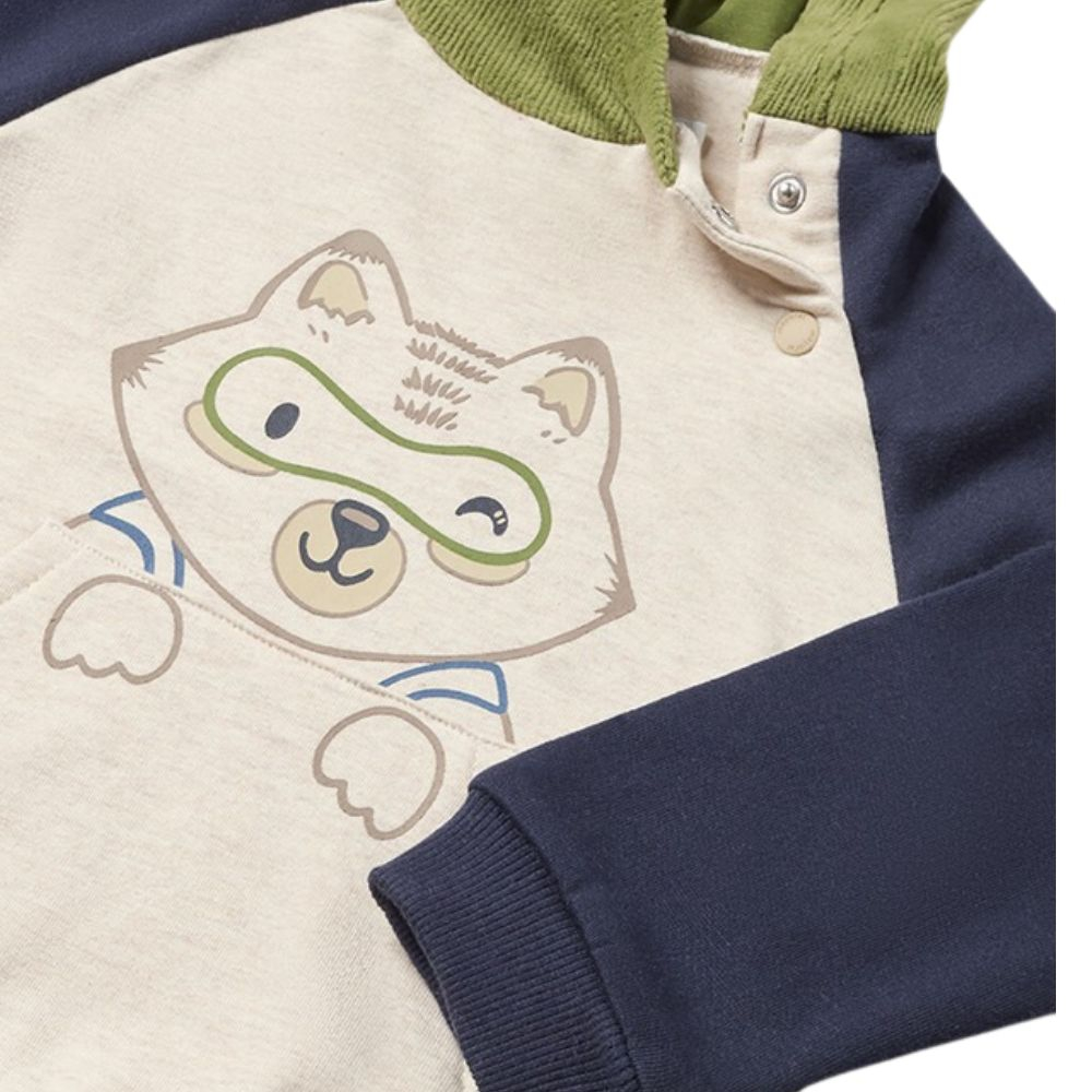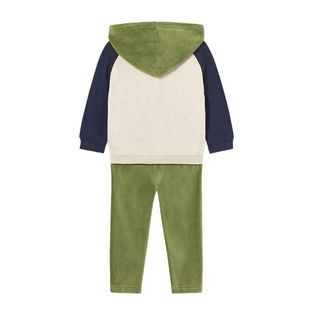 Set 2 piese pantaloni reiat kaki bebeTrening pentru baieti format din trei piese: - hanorac cu fermoar - bluza cu maneca scurta - pantaloni lungiHanorac imprimeuHanoracul cu maneca lunga are guler rotund si gluga din reiat asortata cu pantalonii. Hanoracul are un buzunar mare aplicat pe partea din fata.Materialul este moale si placut la atingere si ofera confort.Material: 66% Bumbac