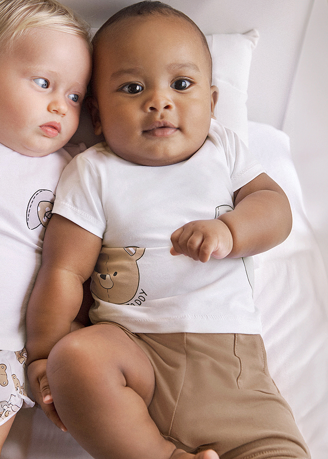 Elemente decorative: detalii cu nervuri, serigrafie (print).Material: 95% bumbac / 5% elastanCuloare: albImprimeu: urs / iepureIntretinere: Spalare: automata / manuala, cu detergent pentru rufe delicate